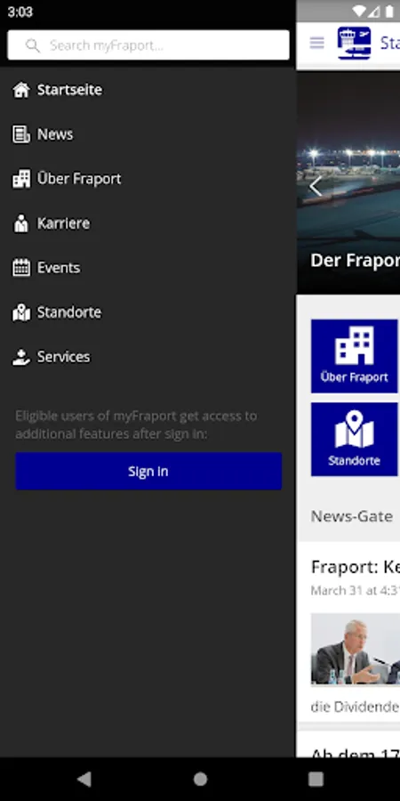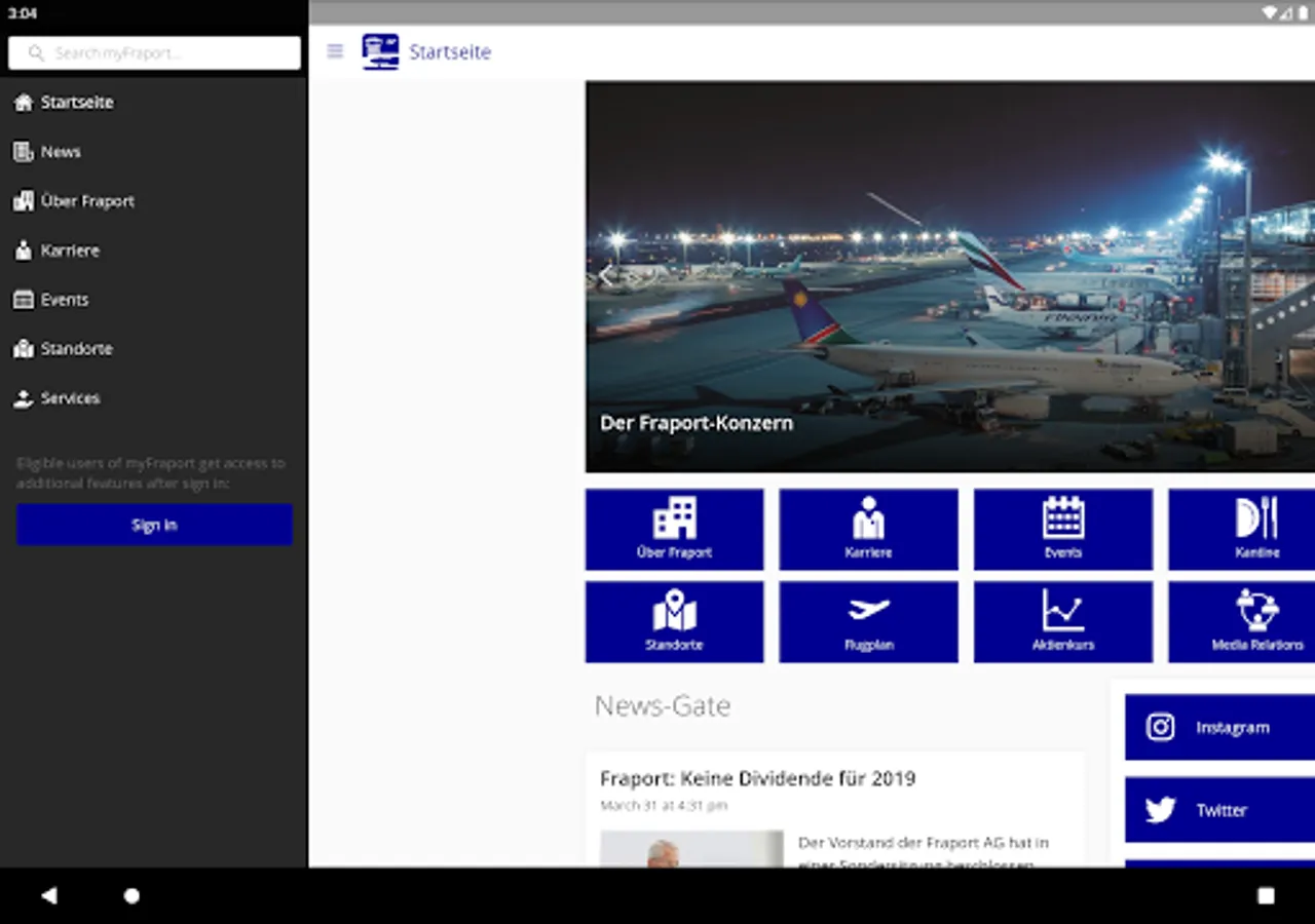 The "myFraport" app offers interested employees, partners and media representatives interactive access to the company. In addition to news, it contains helpful information about Fraport AG, the home airport in Frankfurt and all international locations.