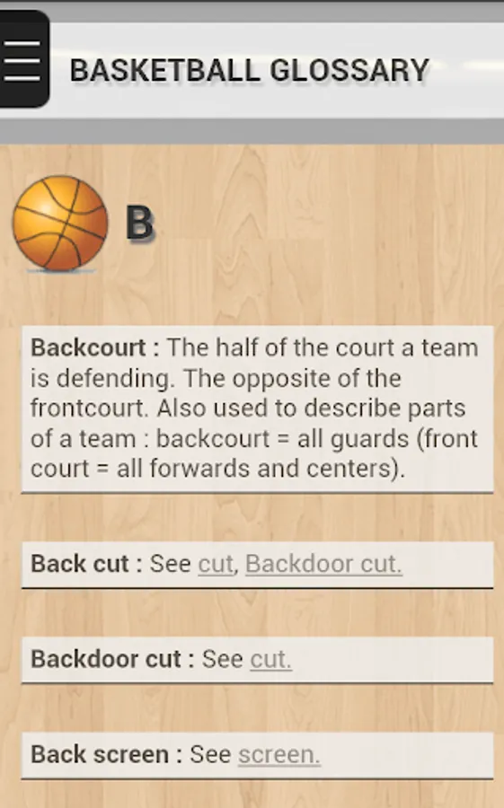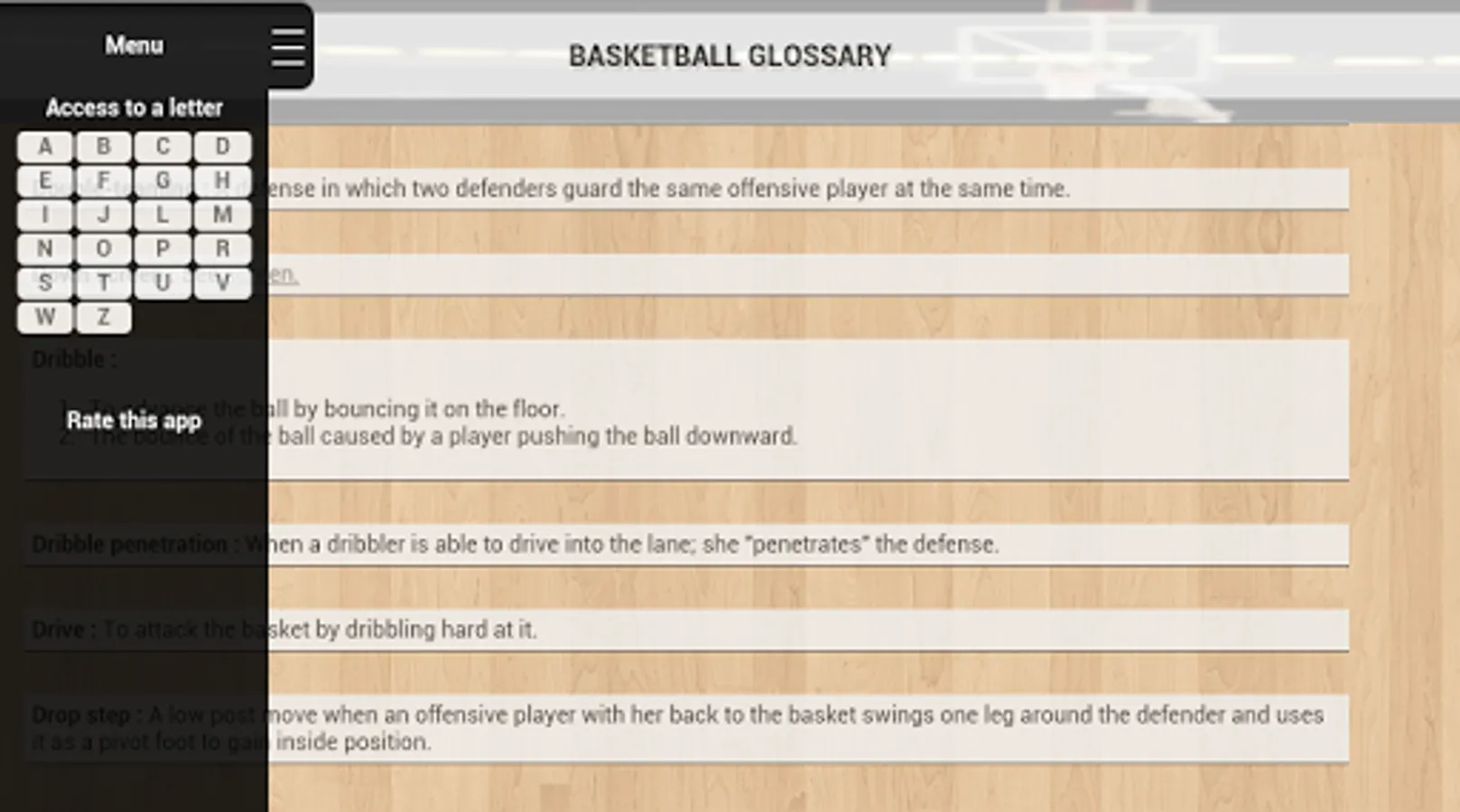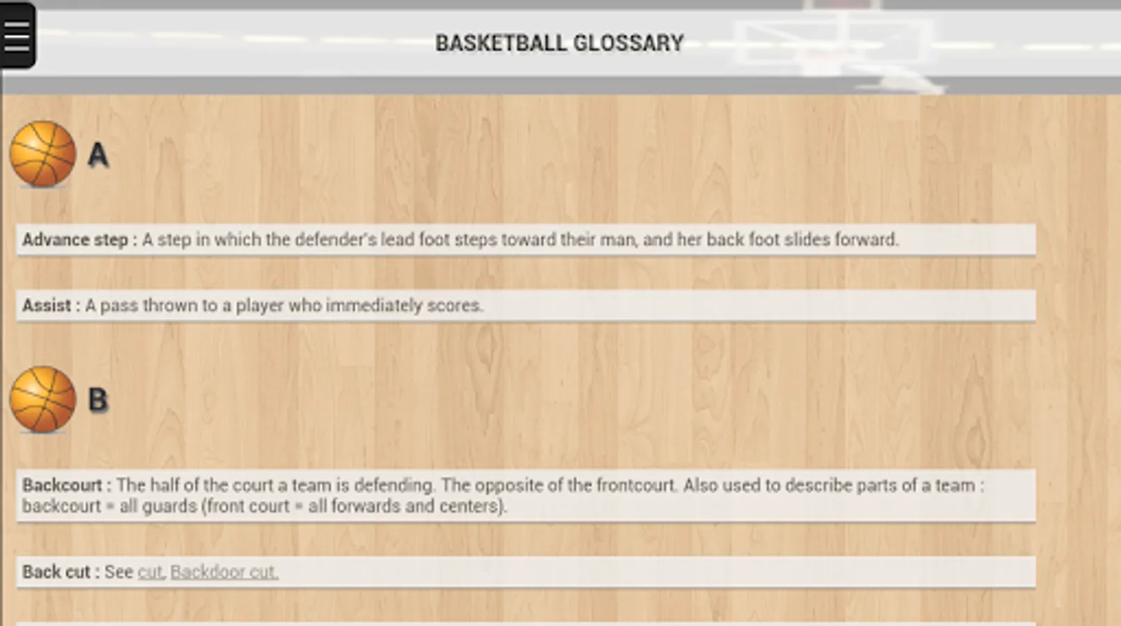 This basketball dictionary contains more than 200 definitions and pictures. With this app you can learn all the vocabulary needed to coach or to understand the game to a higher level.