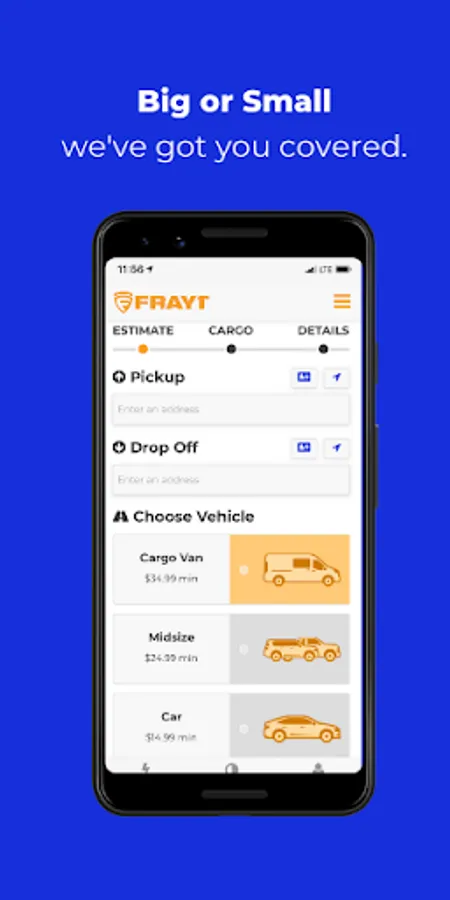 Unlike the other guys, the Frayt fleet includes CARS/COURIERS, CARGO VANS, PICKUP/MIDSIZE TRUCKS, and BOX TRUCKS (coming soon!) to handle the big stuff like hardware, tile, etc.
