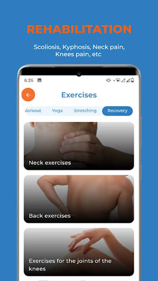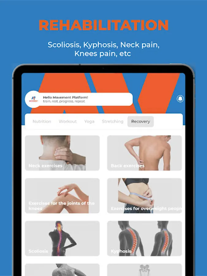 - Rehabilitation - scoliosis, kyphosis, lordosis, valgus, neck pain, knee pain, etc.