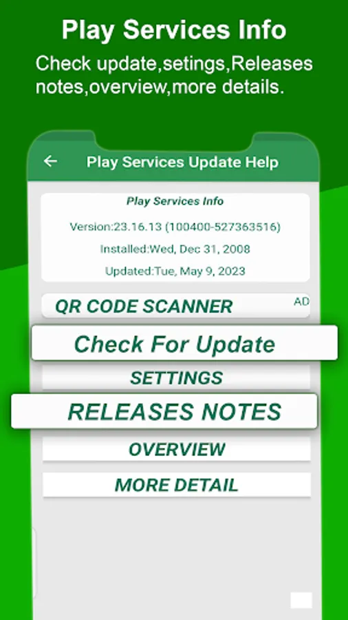 A utility app for quickly checking the status of Google Play services. It displays the version number, installation date, and date of the most recent update. It also includes links to the Play Store, developer release notes, and the app info dialog.