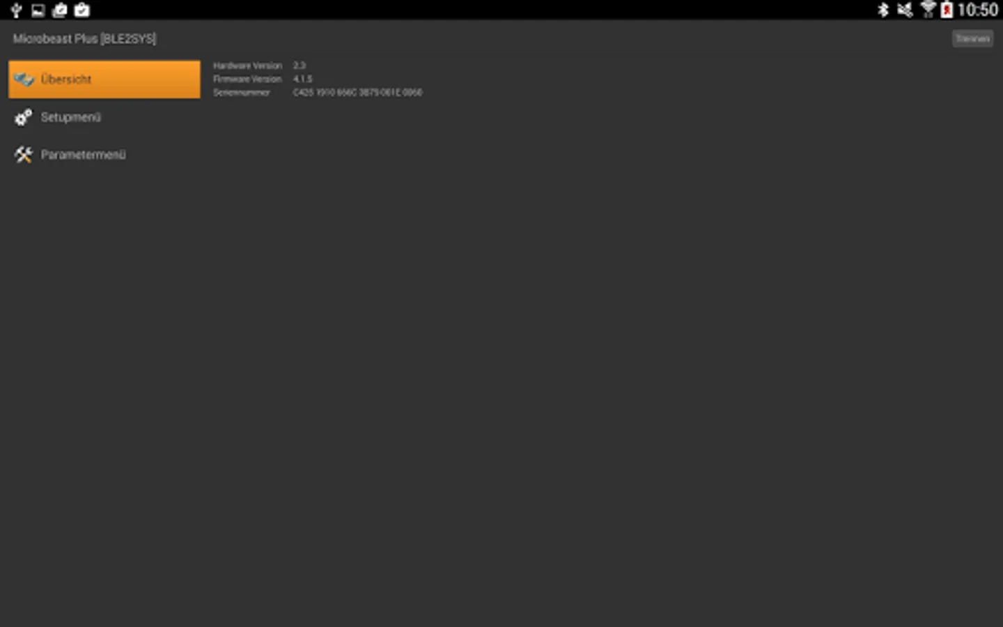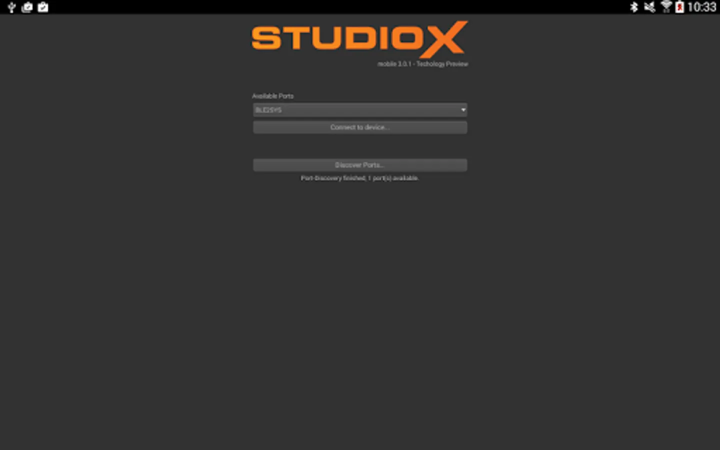 Note: Make sure to give the App privileges for using the bluetooth connection and to write data to the internal storage. On some devices it is necessary to do this manually in the Application settings! (When the StudioXm App is not allowed to write to the internal storage your user specific settings will not be saved, i.e. language and port settings, device names, storing RestorePoints, etc.) Also make sure to allow the App to access your internet connection in case you want to download firmware update files for your device. Note this may produce extra costs when using your mobile data connection!