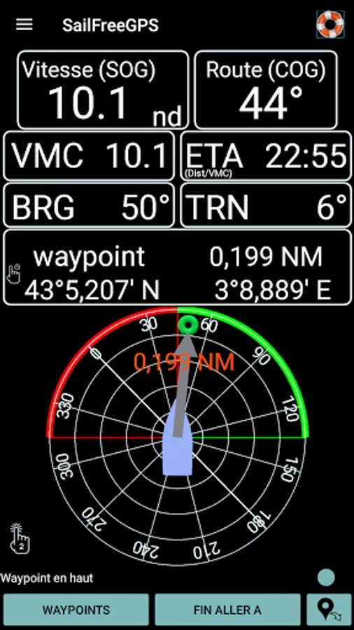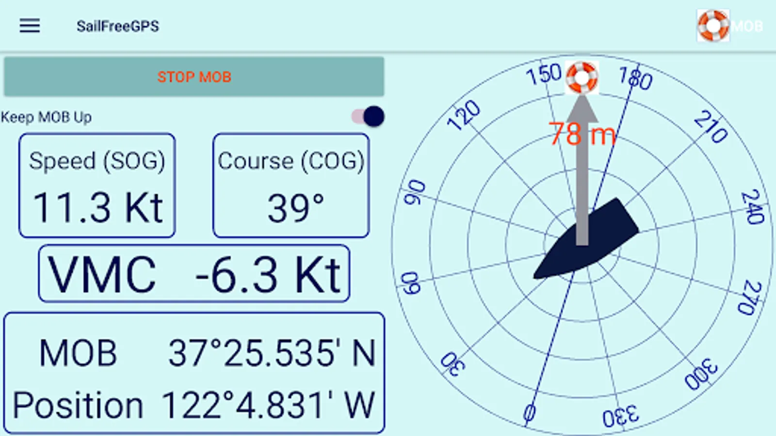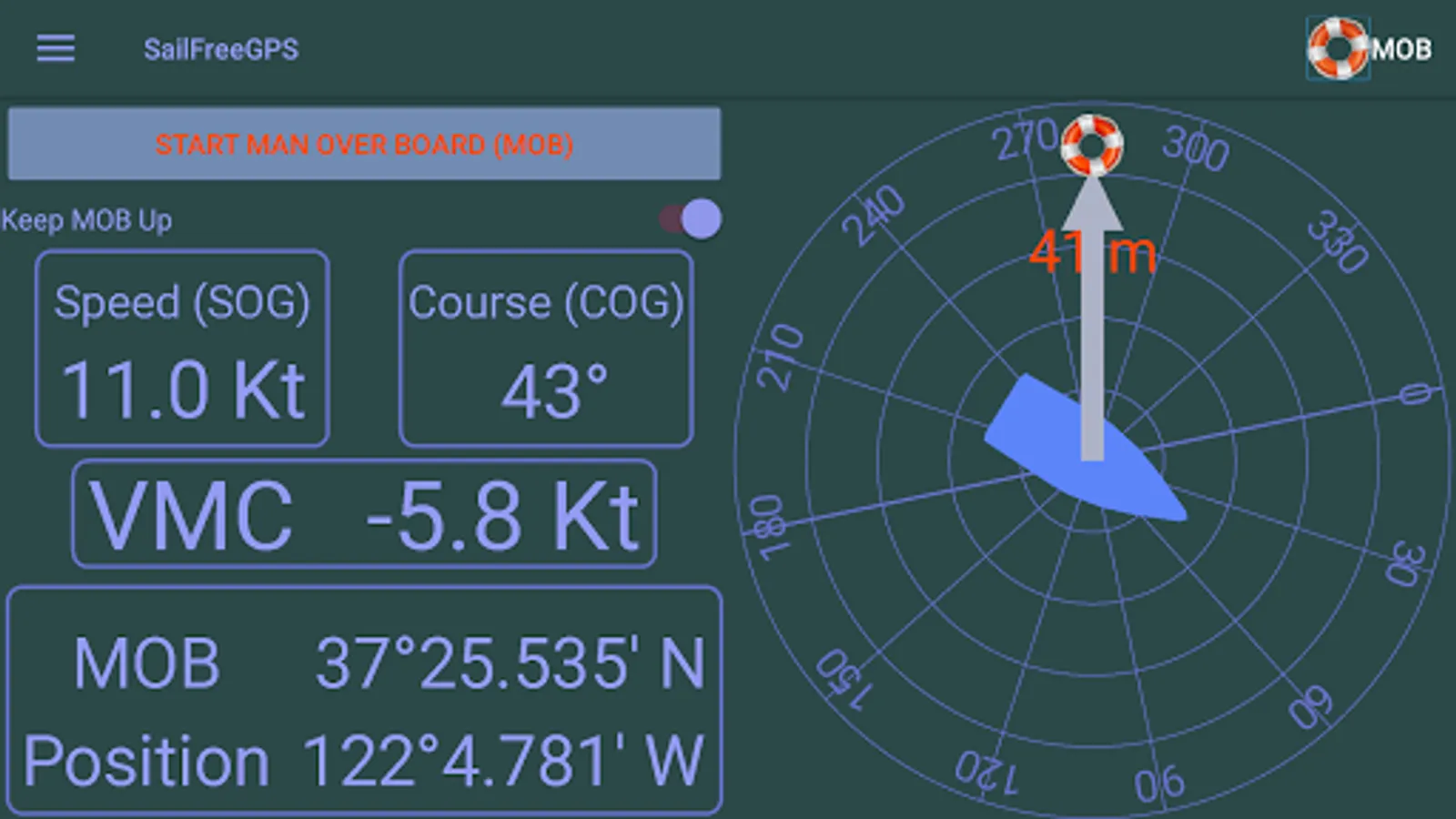✓ SailFreeGPS helps you during Man OverBoard maneuver (MOB). It stores the location and lead you to it.