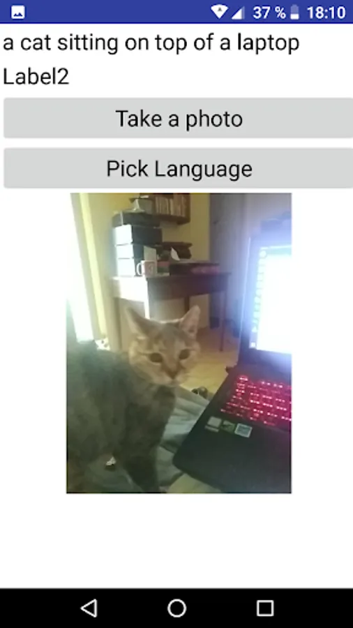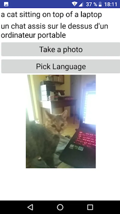 Take a photo, the application will describe the photo according to an AI. You can then translate this description.