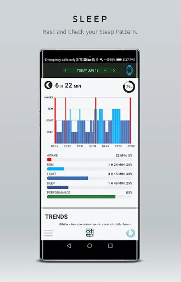 Get details on how much time you spent in deep sleep, light sleep or awake, as well as how long it took to fall asleep and how many times you woke up.