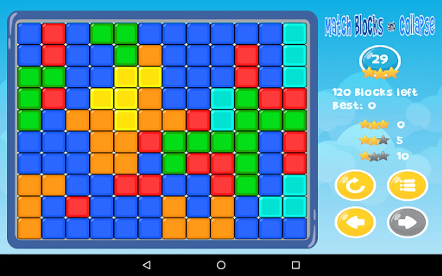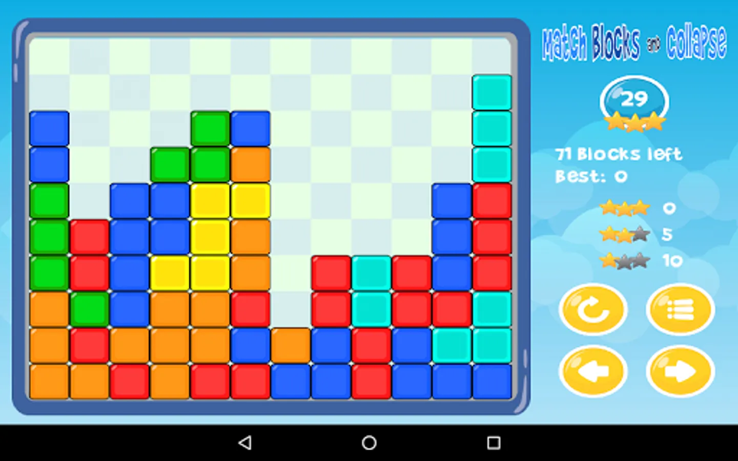 The rule is simple: you can collapse blocks when they are in a group of three blocks of same colors. After blocks were removed, the others gather. New groups appears and you can continue clean screen. When no block is on screen, you win and you unlock next level!