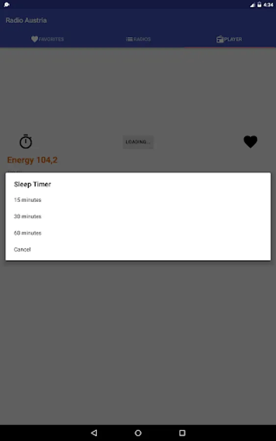 A sleep timer can be used to stop the radio after 15, 30, or 60 minutes.