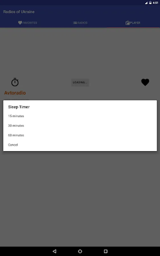 A sleep timer can be used to stop the radio after 15, 30, or 60 minutes.
