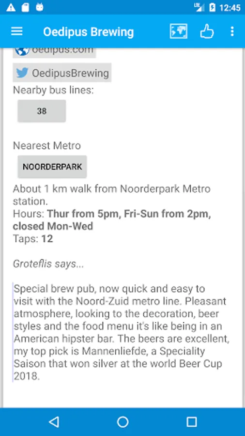 Each entry contains a review, photograph, nearest public transportation, contact info, website and twitter handle for each pub. Check the pub's twitter feed for news without leaving the app. A map will show the location of the pub as well as nearby listed pubs.