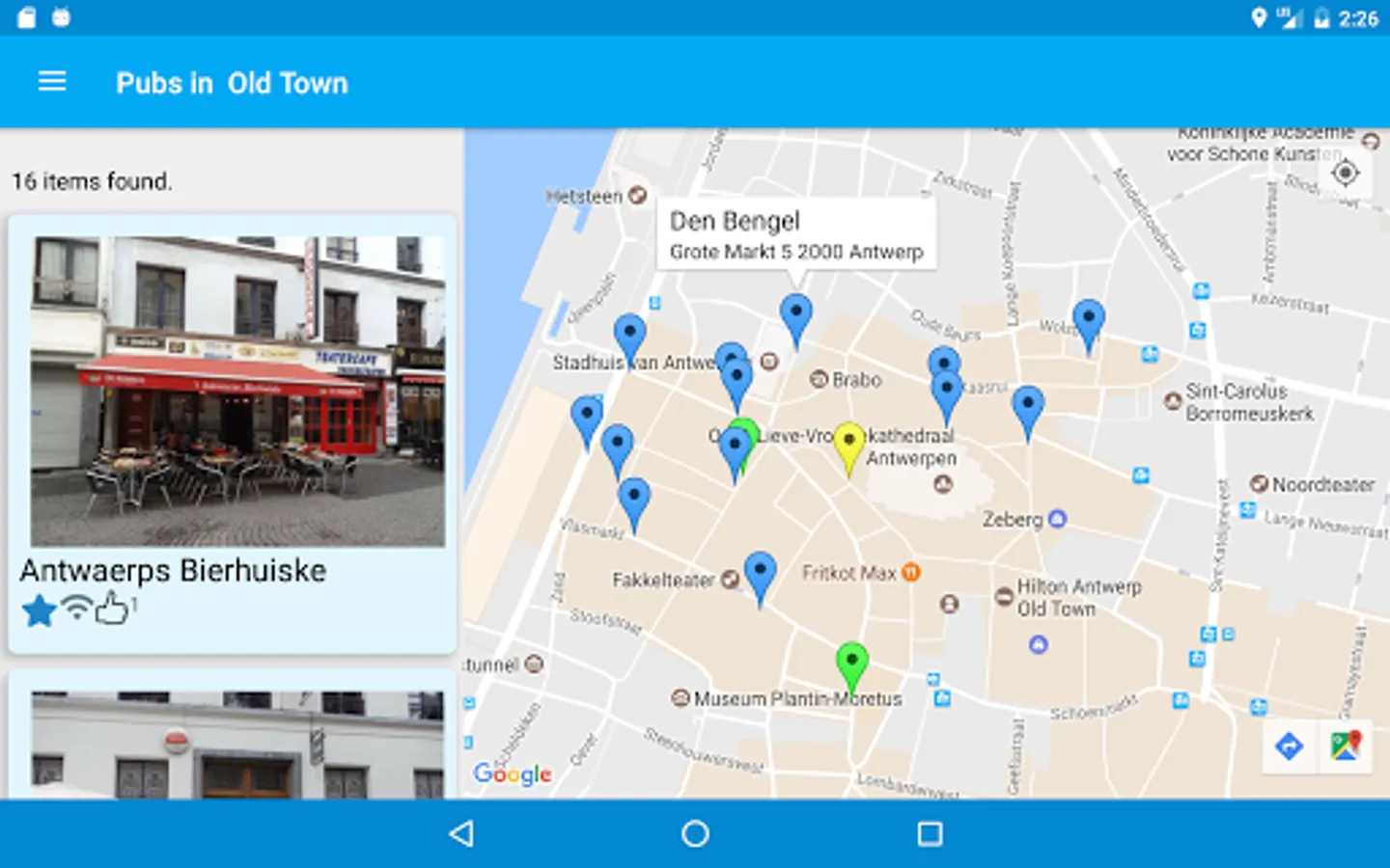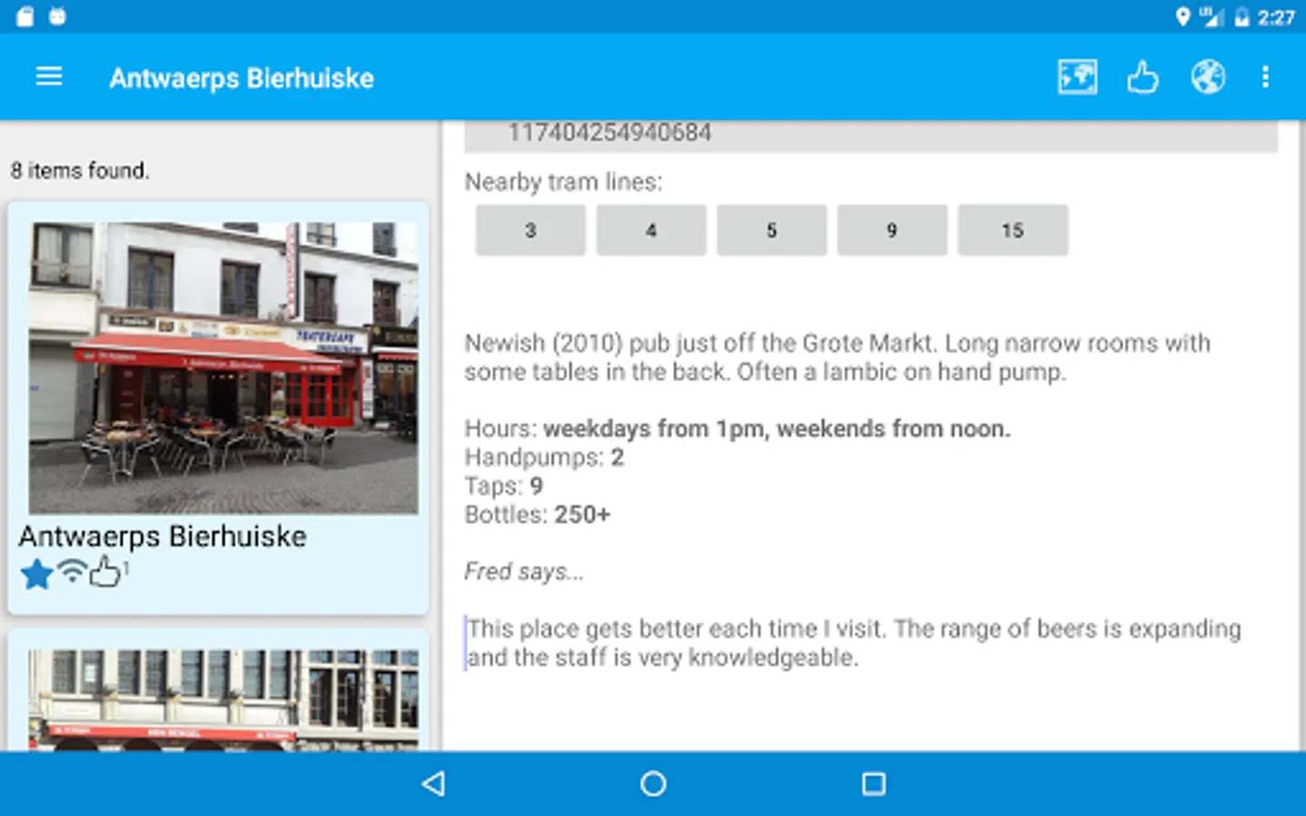 Each entry contains a review, photograph, nearest tram line, contact info, and website for each pub. . A map will show the location of the pub as well as nearby listed pubs. Check the weather forecast or flag your favorite pubs for future reference -- and see which pubs others have favorited.