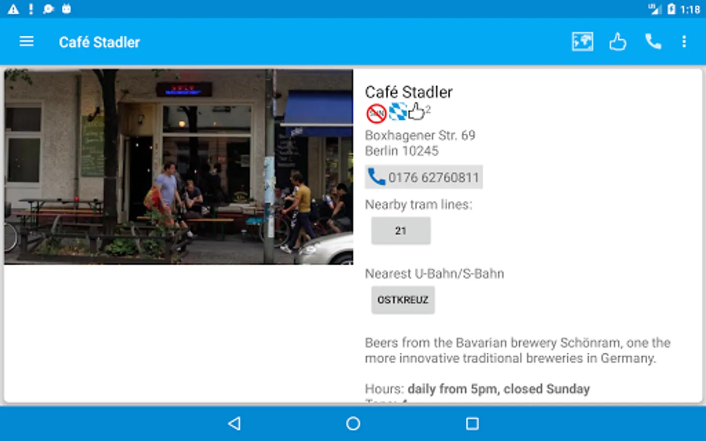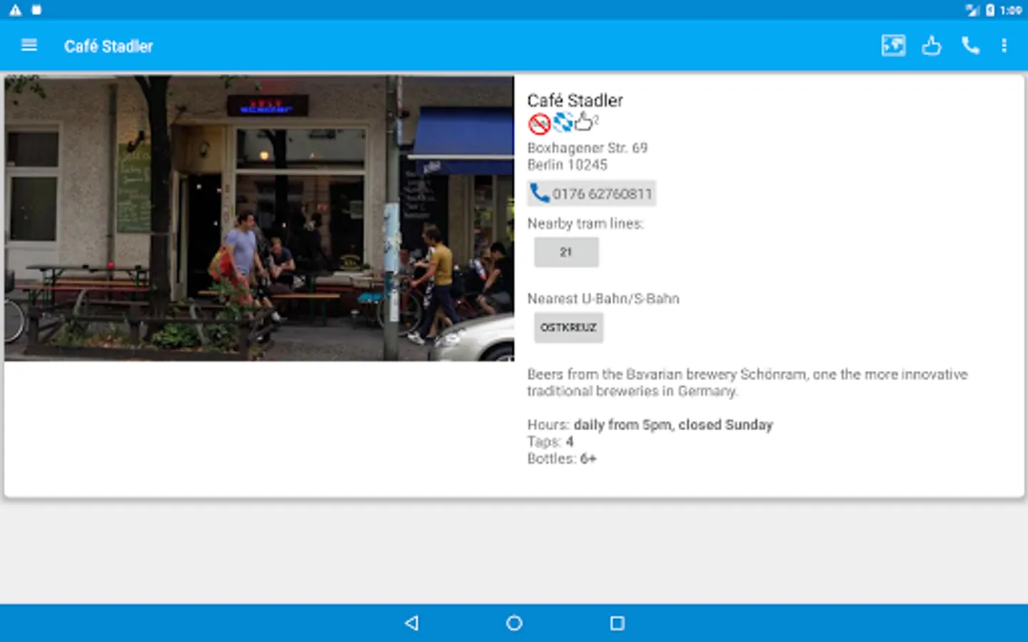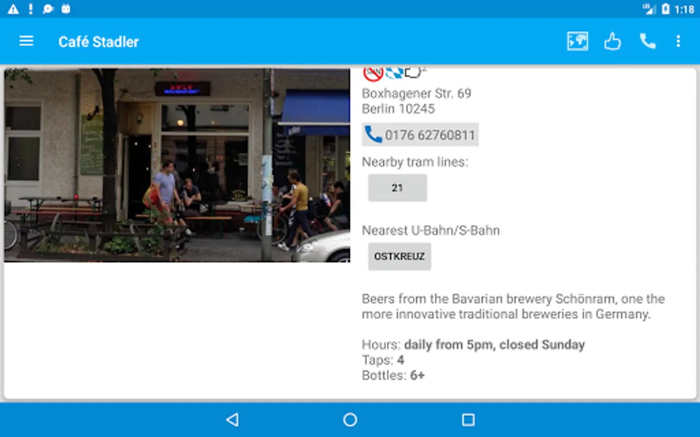 Each entry contains a review, photograph, nearest U Bahn or Tram line, contact info, website and twitter handle for each pub. Check the pub's twitter feed for news without leaving the app. A map will show the location of the pub as well as nearby listed pubs.