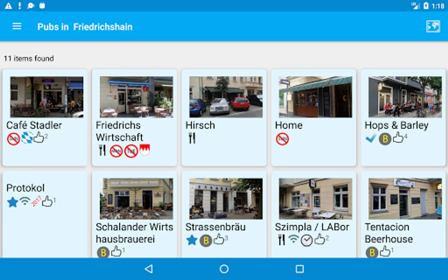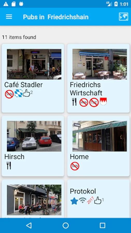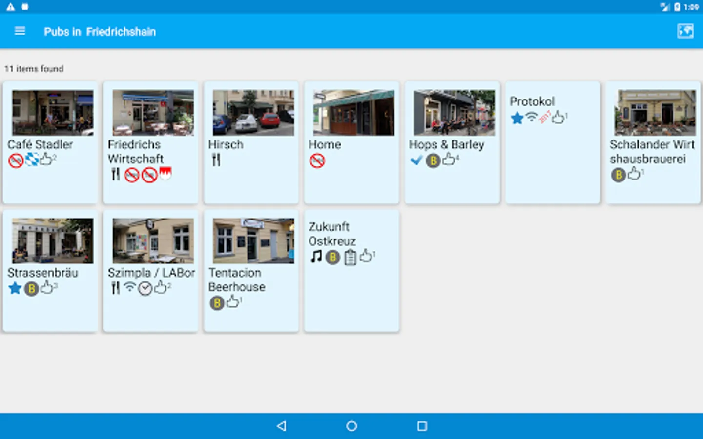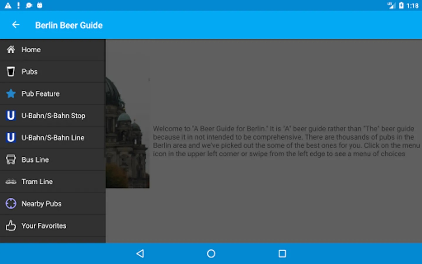 Each entry contains a review, photograph, nearest U Bahn or Tram line, contact info, website and twitter handle for each pub. Check the pub's twitter feed for news without leaving the app. A map will show the location of the pub as well as nearby listed pubs.