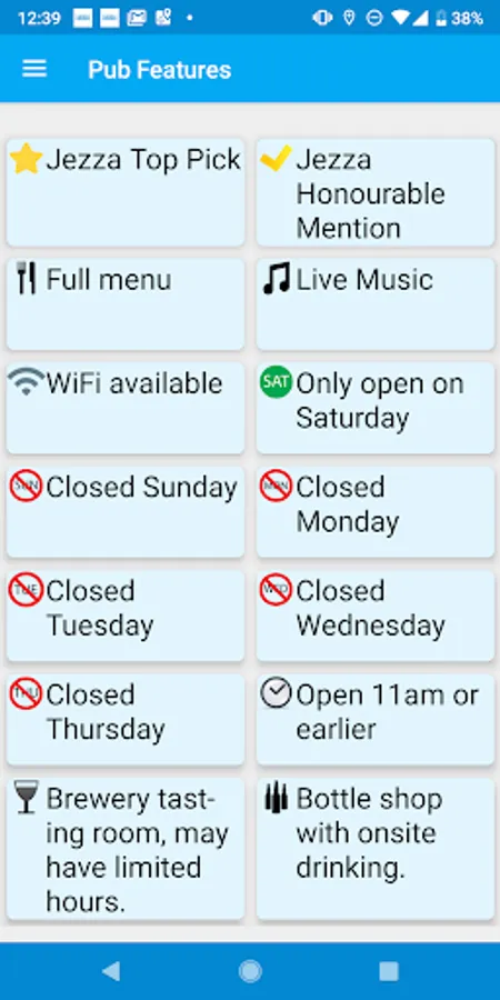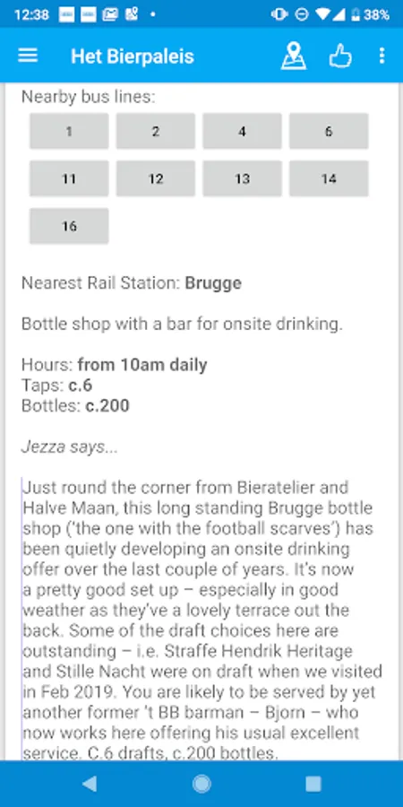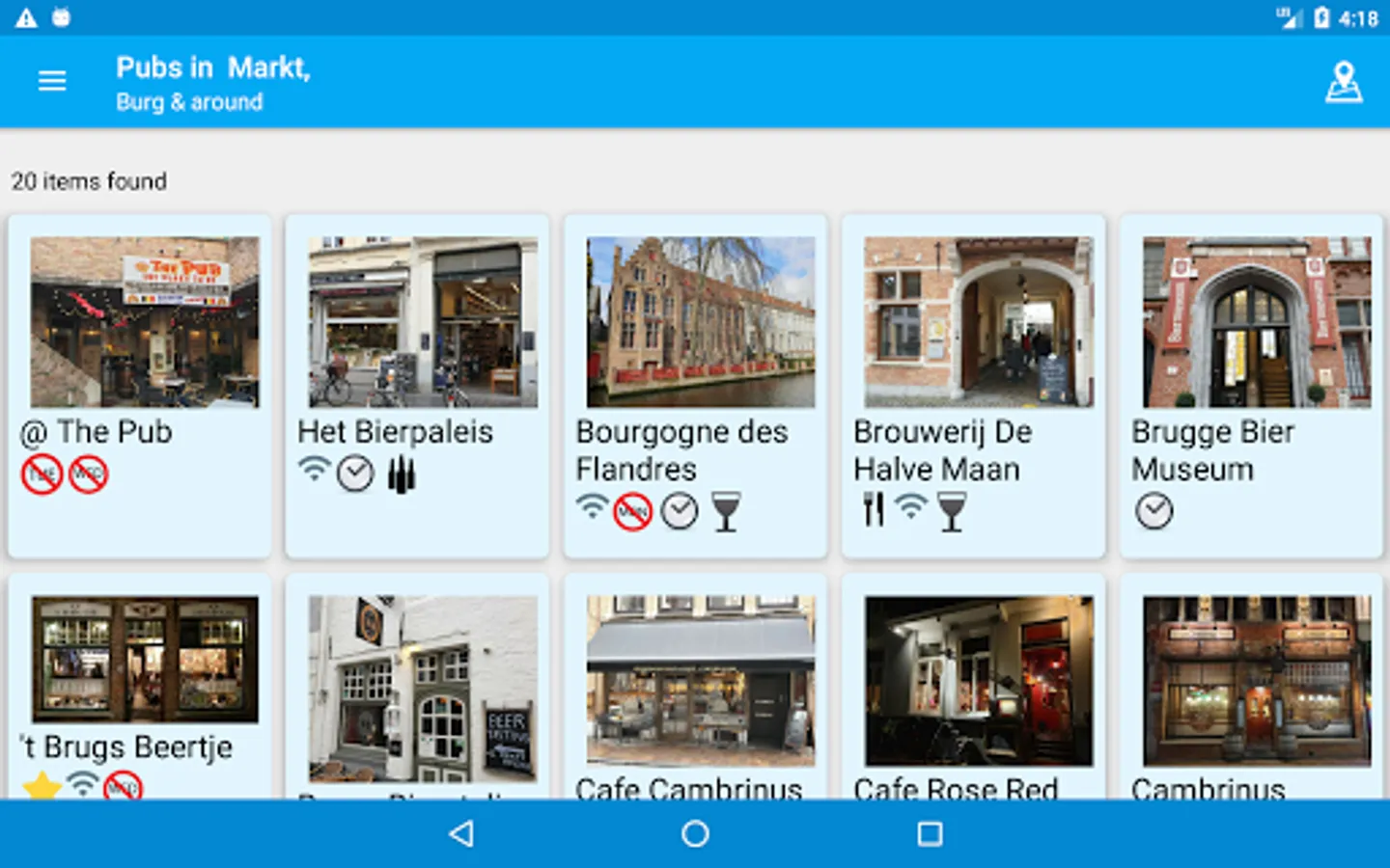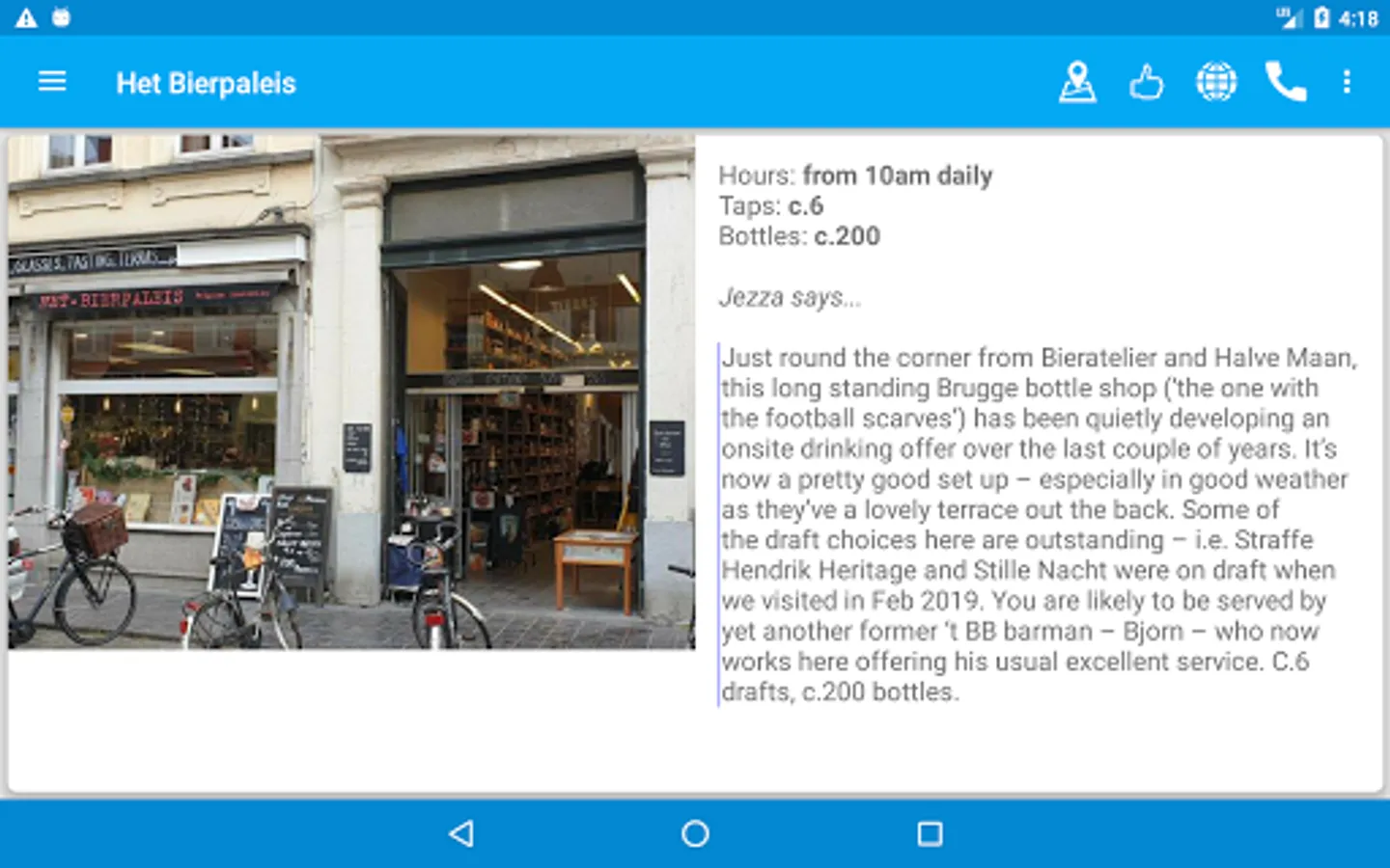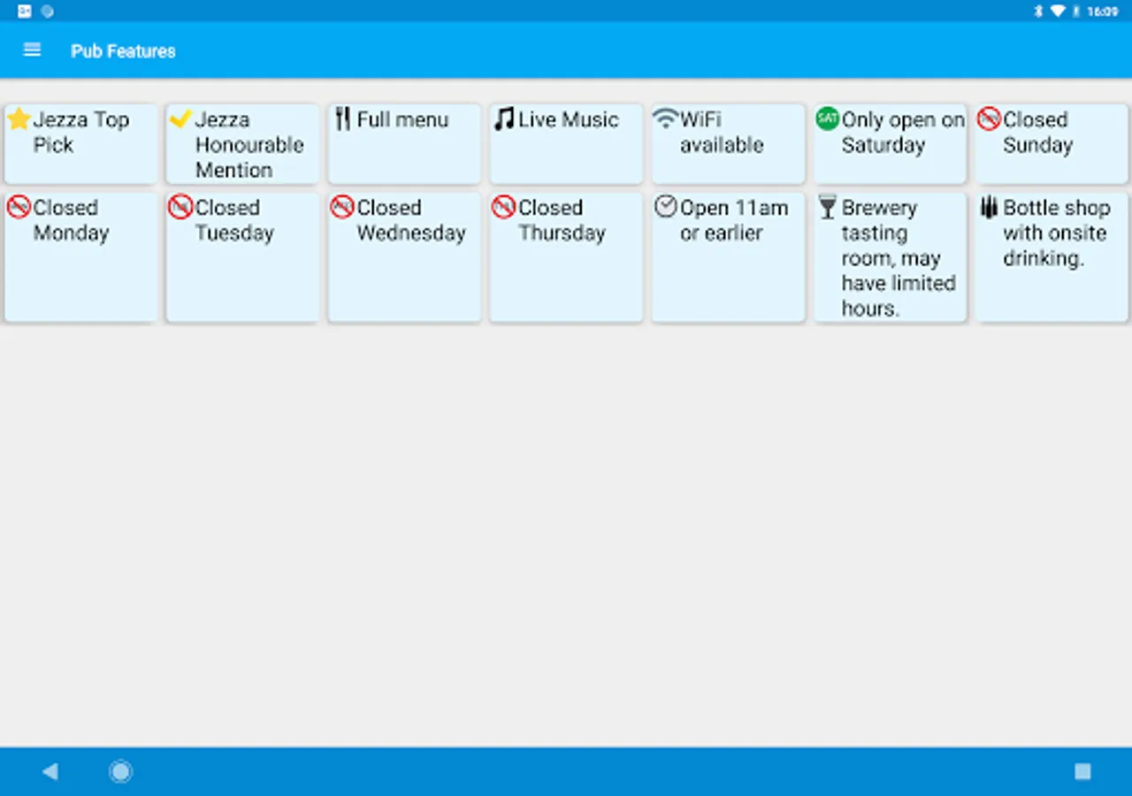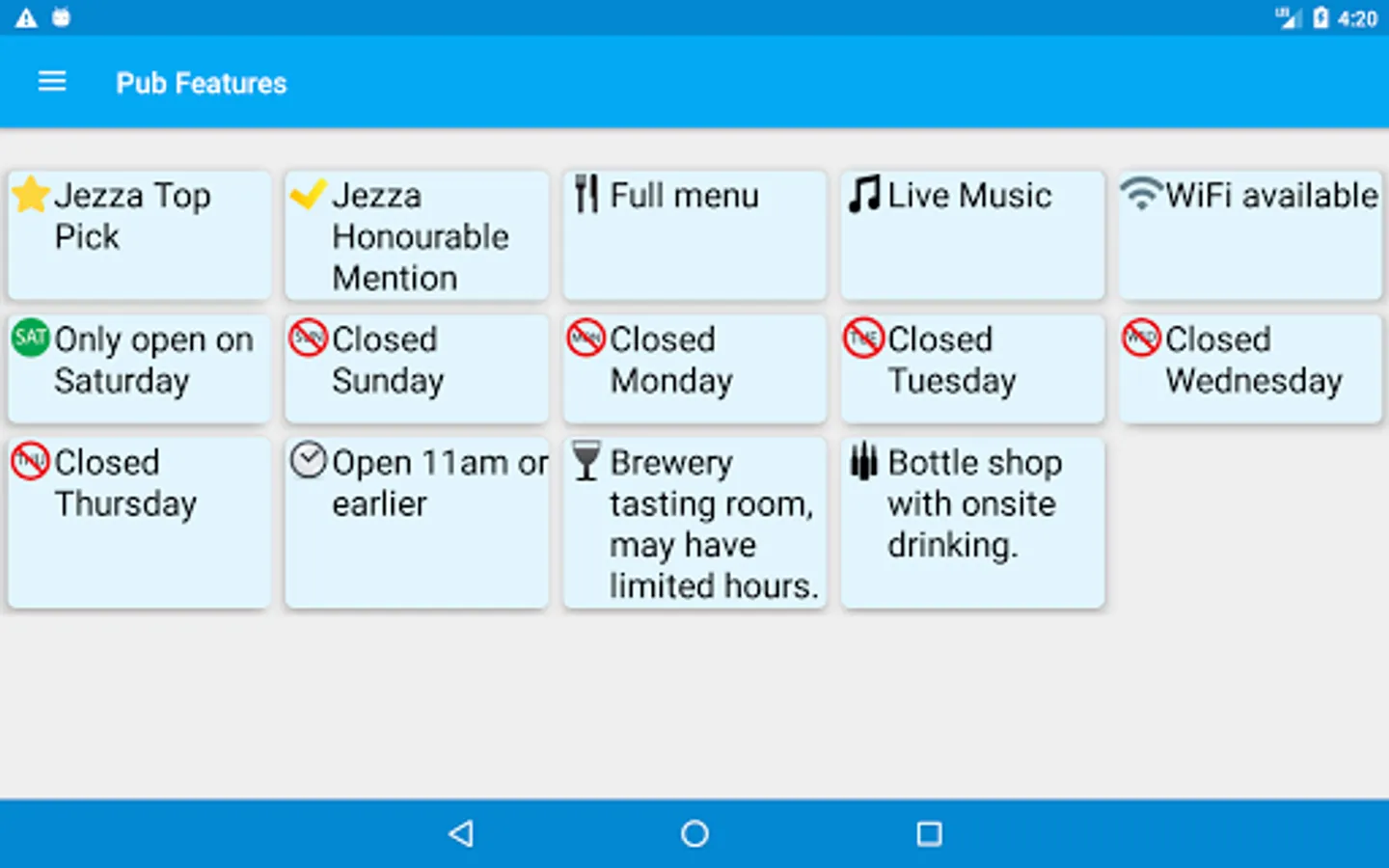 Each entry contains a review, photograph, nearest public transportation, contact info, website and twitter handle for each pub. Check the pub's twitter feed for news without leaving the app. A map will show the location of the pub as well as nearby listed pubs.