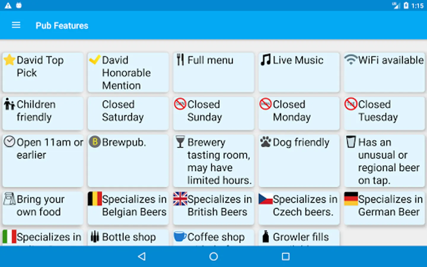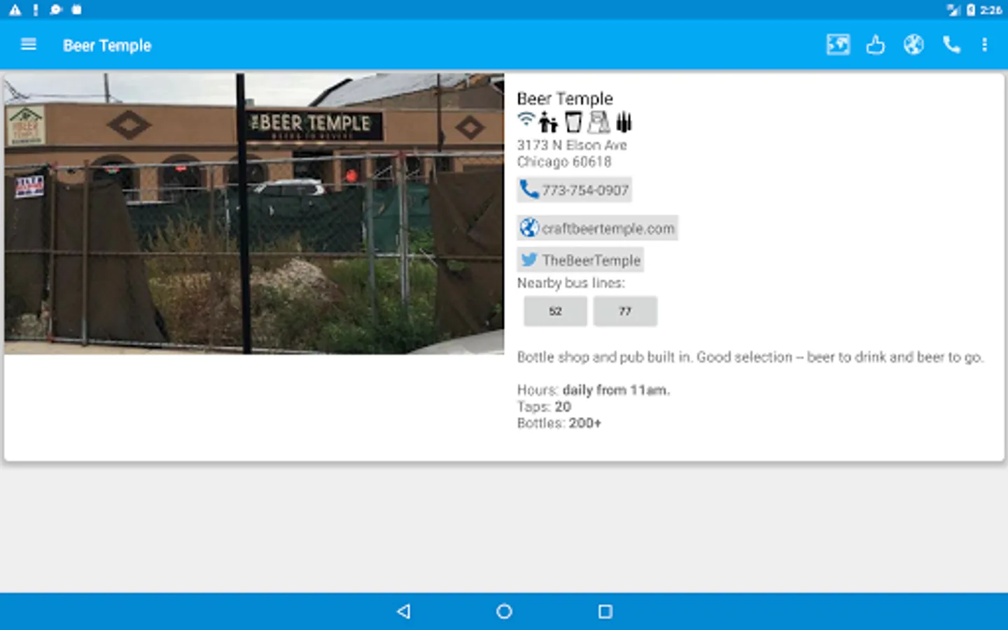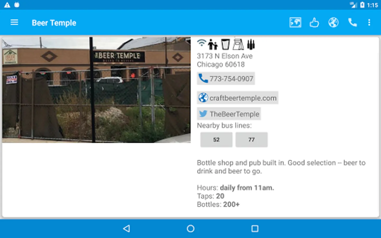 Each entry contains a review, nearest public transportation, contact info, website and twitter handle for each pub. Check the pub's twitter feed for news without leaving the app. A map will show the location of the pub as well as nearby listed pubs.