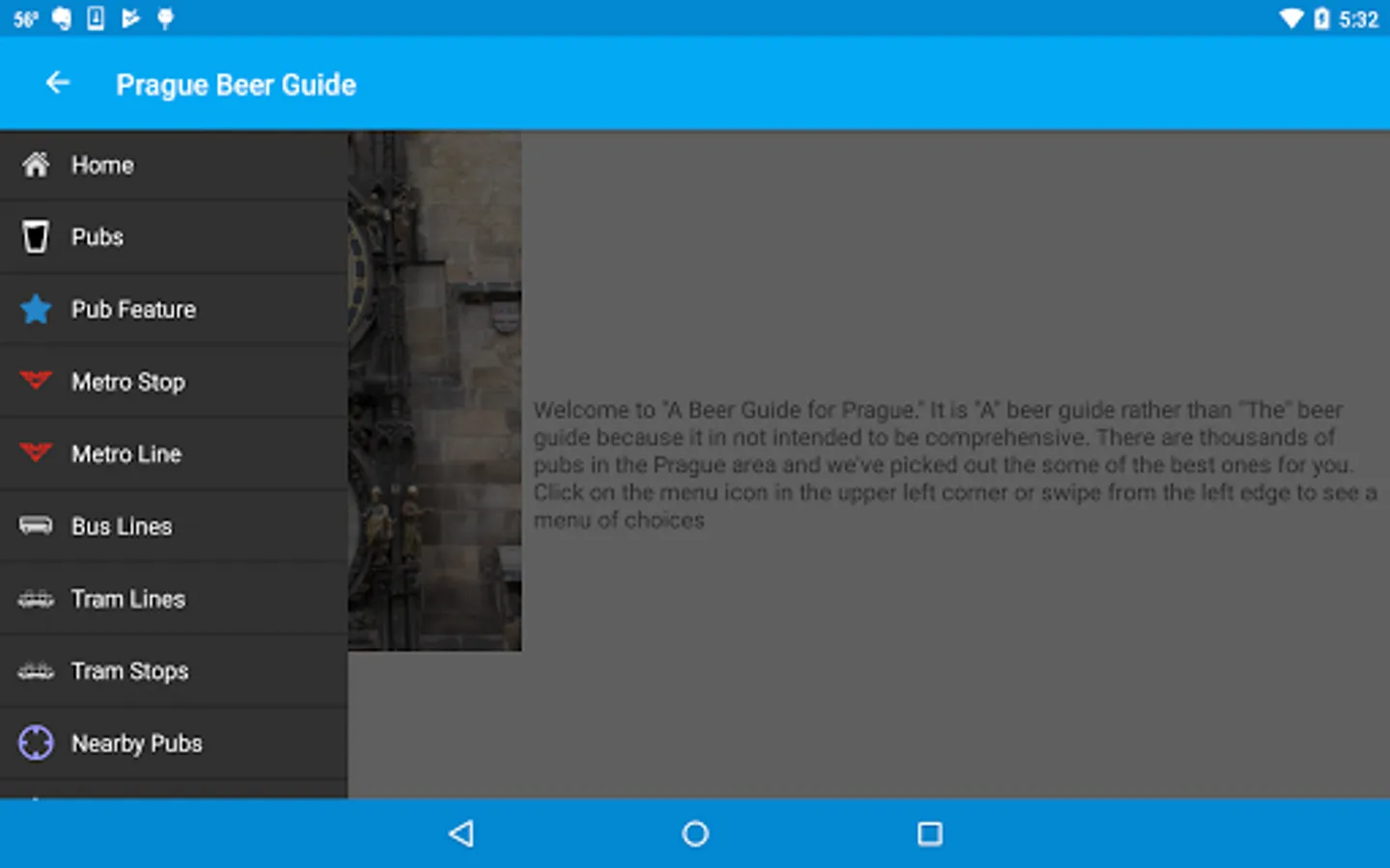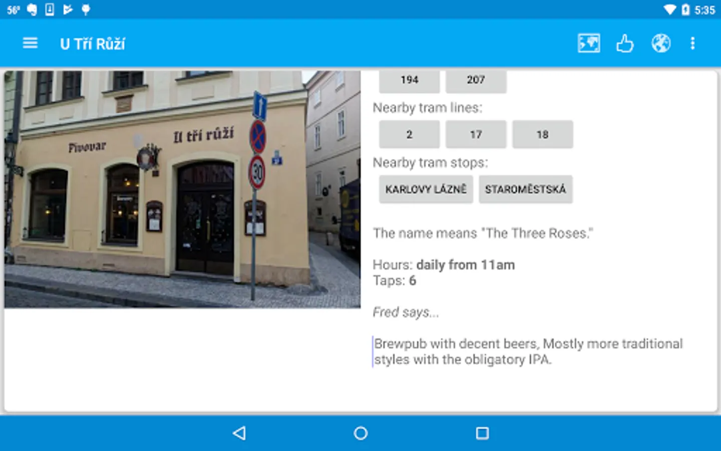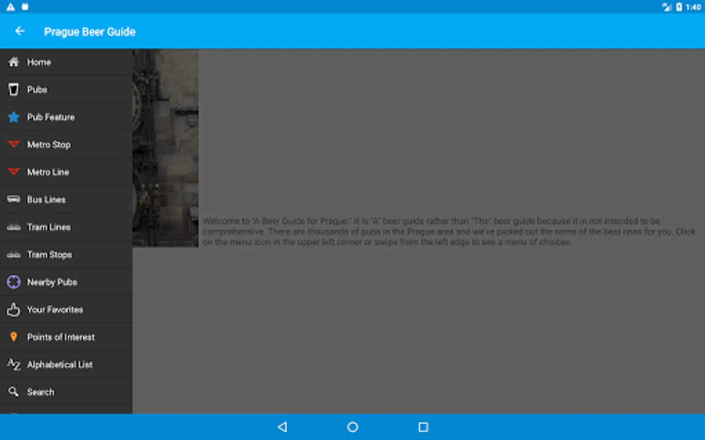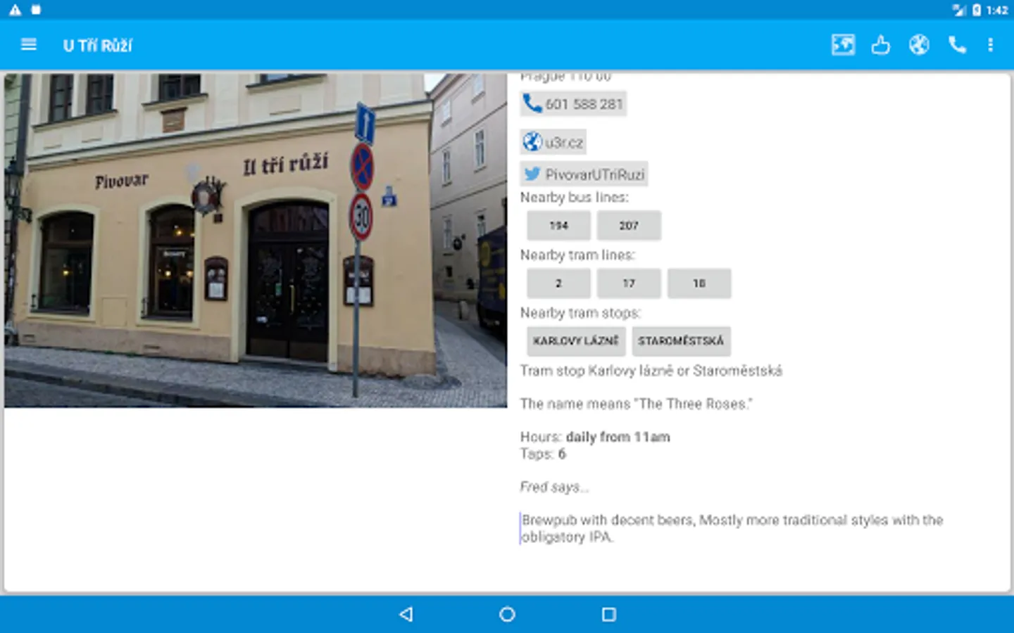 Each entry contains a review, photograph, nearest metro or tram linen, contact info, website and twitter handle for each pub. Check the pub's twitter feed for news without leaving the app. A map will show the location of the pub as well as nearby listed pubs.
