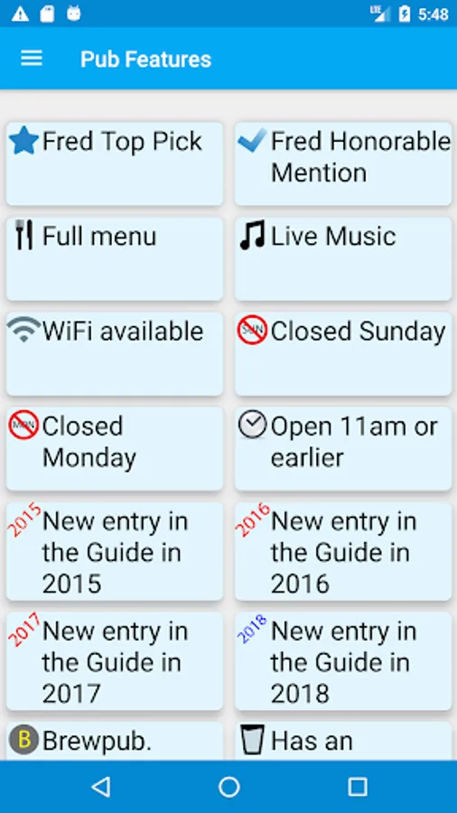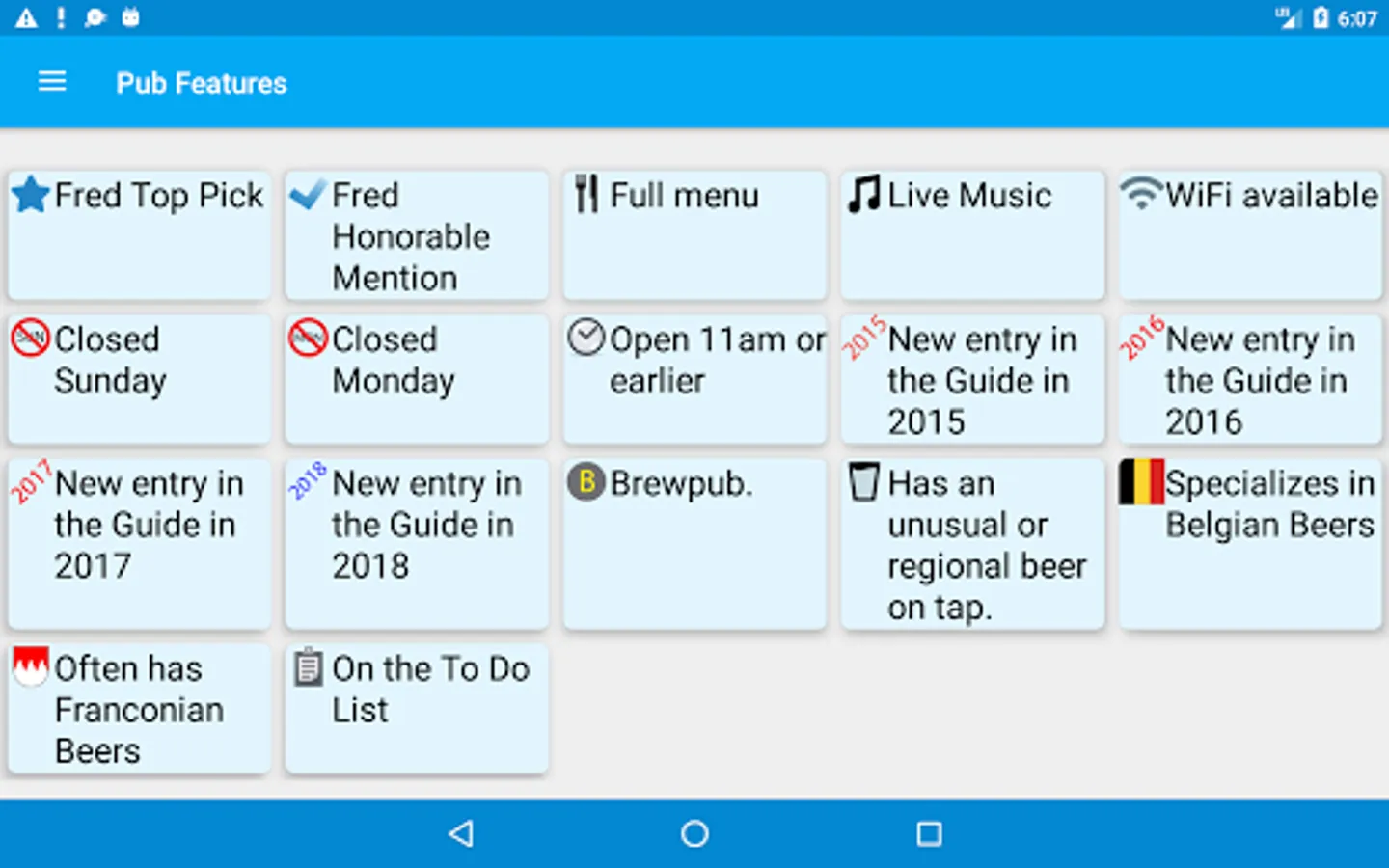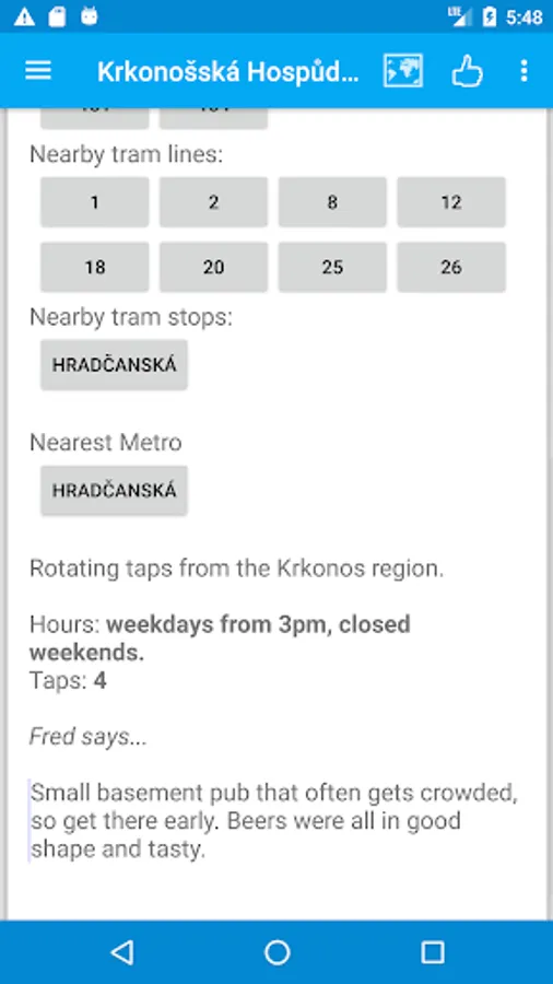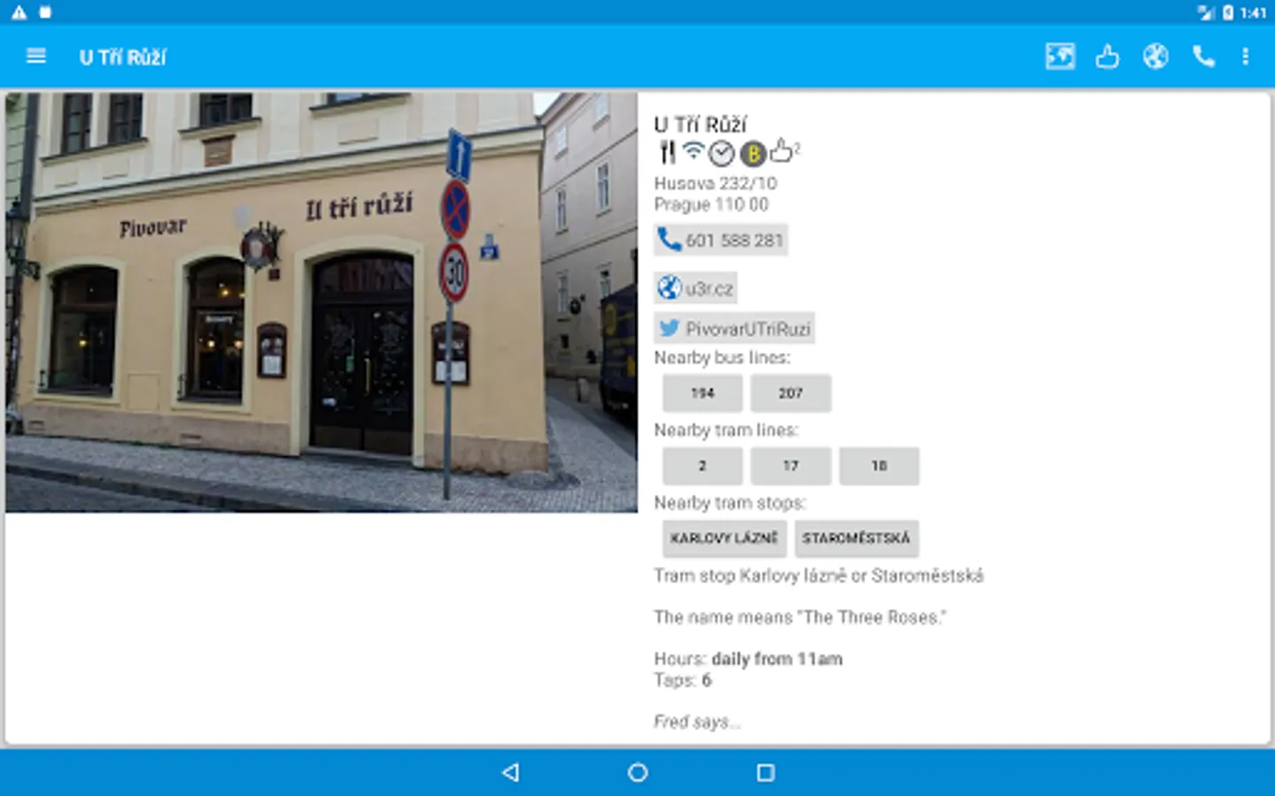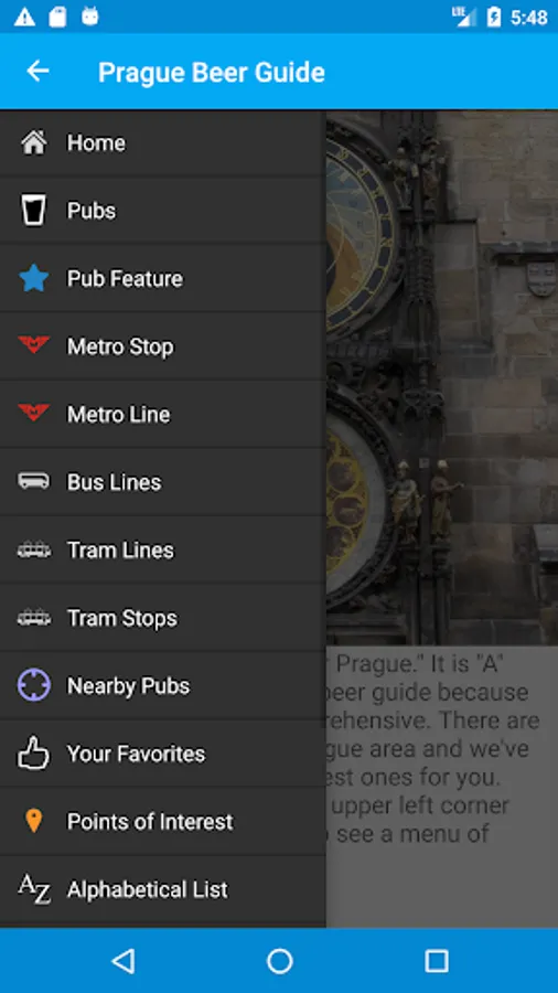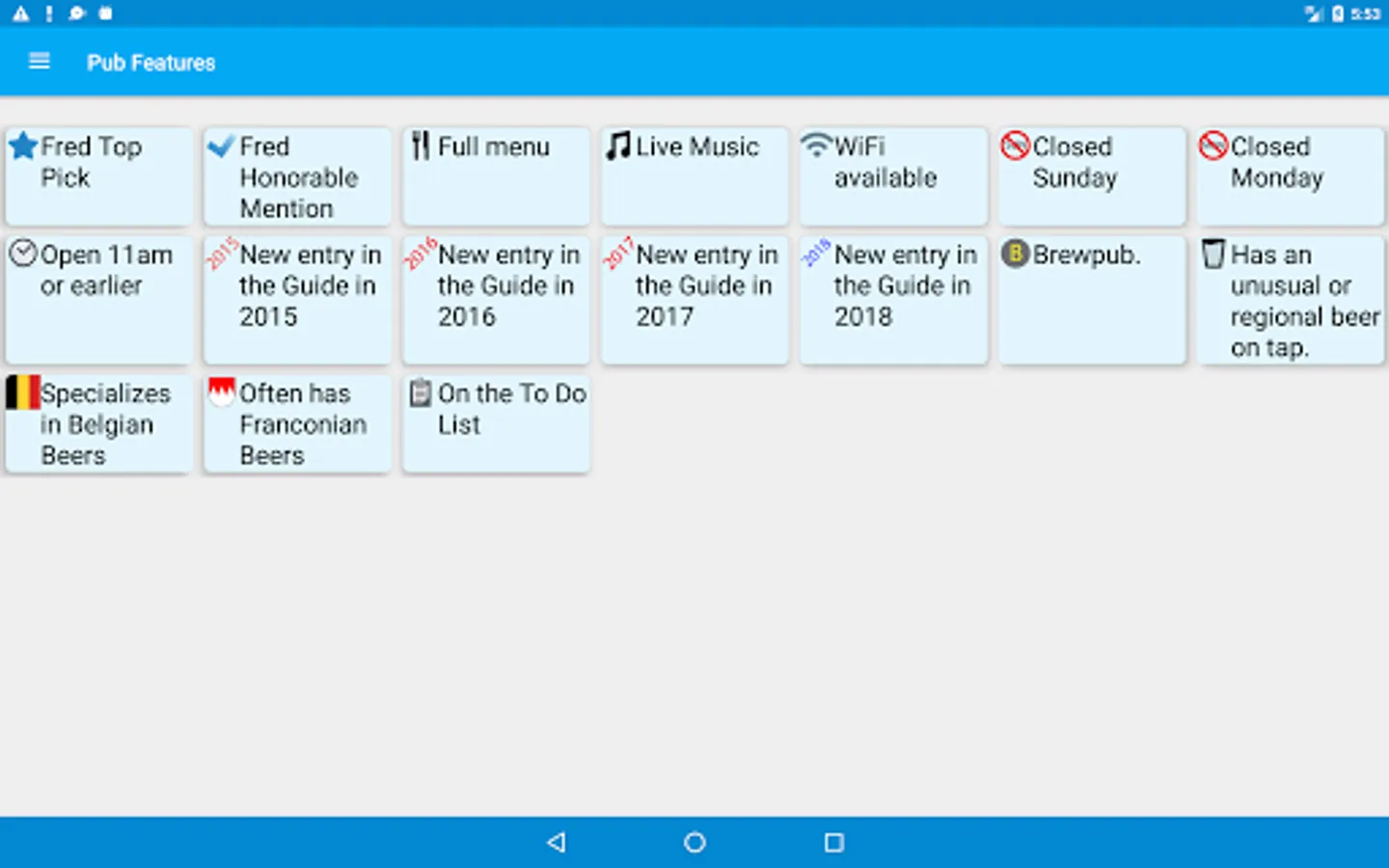 Each entry contains a review, photograph, nearest metro or tram linen, contact info, website and twitter handle for each pub. Check the pub's twitter feed for news without leaving the app. A map will show the location of the pub as well as nearby listed pubs.