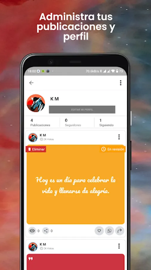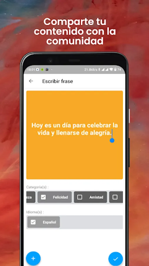 Are you going through a difficult time and need an extra boost? Or do you just enjoy sharing inspirational quotes on your social networks? Motivation is the app that gives you the motivation and inspiration you need. With our wide selection of motivational phrases and inspirational quotes, you will find the perfect phrase for any moment. Share your favorite quotes with the community and react, comment on other people's posts. Personalize your profile and review your phrases and reactions. Receive daily notifications to keep you motivated and updated. Discover the best collection of phrases.