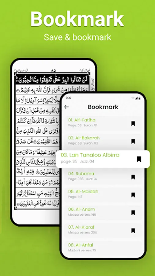 Holy Quran Pak : Quran Sharif All surah helps you to build bookmarks file. Save favorite reading surah or page with unlimited bookmarks القران المجيد can Add bookmarks to revise and reread Ayats, chapters, and Surahs. It can be arbitrary or orderly. For the direct reciting view of the chapter etc just click the bookmark icon and there will be all your mentioned bookmarks.