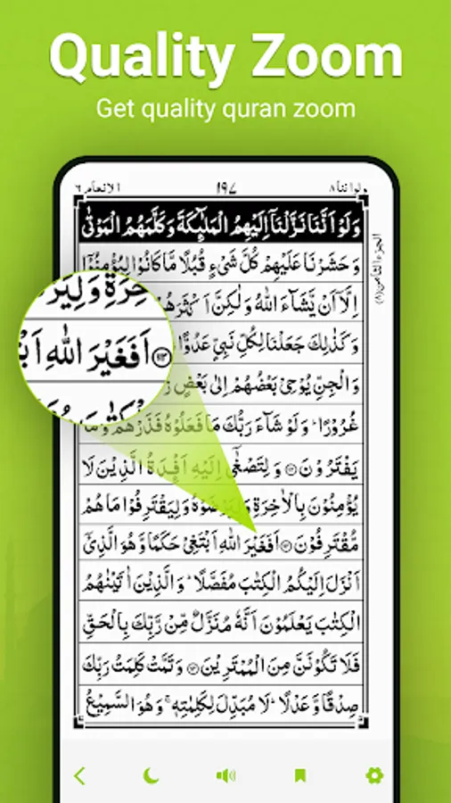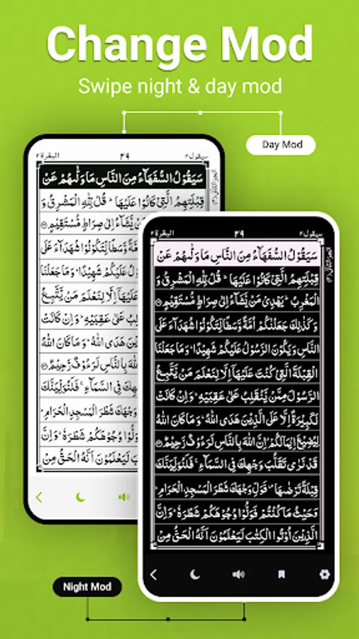 Holy Quran Sharif has different modes are to be set for the day and night timings Holy Quran Pak offline app. القران الكريم to avoid pinching light in the eyes select night mode that is dark like surrounding so no sharp light at night free Holy Quran Pak. Likewise, the bright vision of 13 lines At Koran ul Kareem offline app.