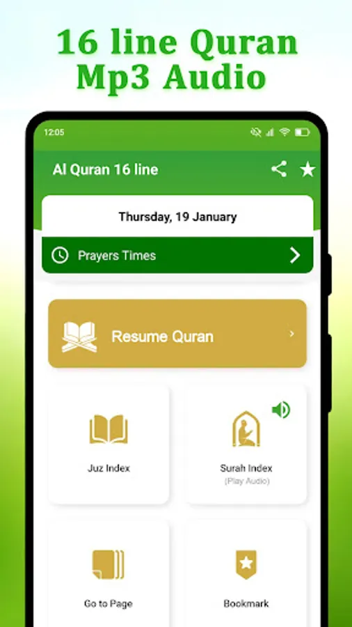 16 line Quran often used in mosques and madarsas for memorizing purpose. Mp3 Audio Quran app has beautiful interface which makes your feel like you are reading actual 16 line Quran. Swipe from left to right to go next page. Most of the Huffaz use the 16 line Quran text format around the world to remember it.