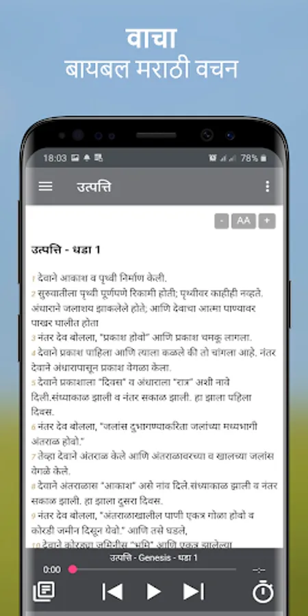 Offline Holy Scripture Verse Marathi Bible. In the beginning God created the heavens and the earth. [Genesis 1:1]