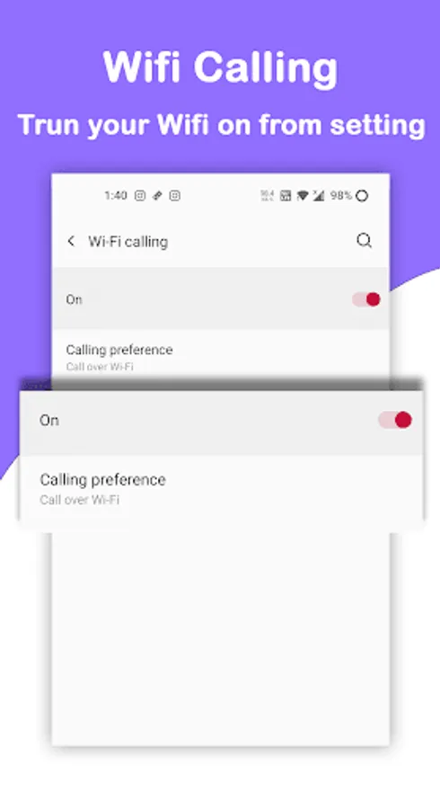 * Disclaimer : This app will open Wifi Settings if your device has the Wifi Calling feature. We do not claim any call over wifi with our app. Also, if your mobile carrier supports Call Wifi then this feature is useful for you.