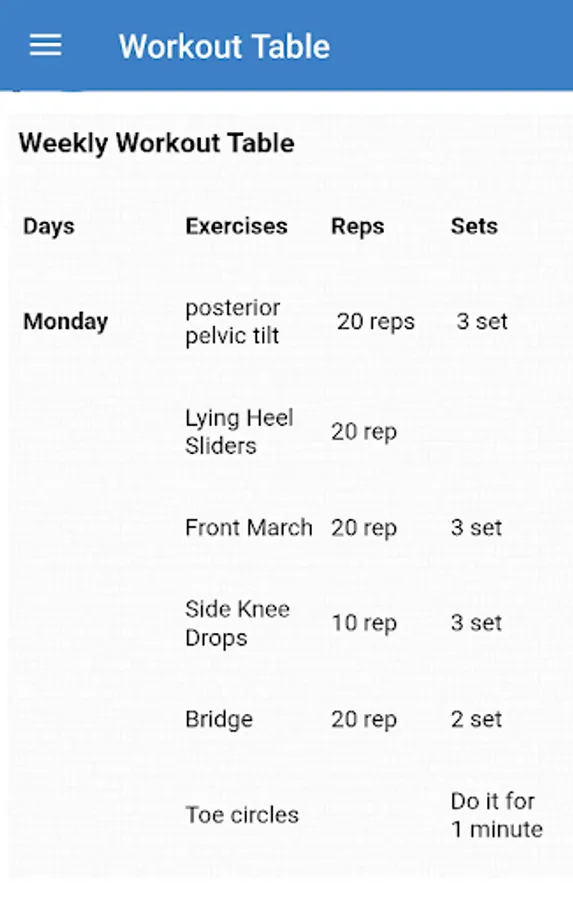* Exercises (posterior pelvic tilts, Heel Sliders' sitting-lying and horizantal), Leg Extensions, Front March, Side Knee Drops, Bridge, Straight Leg Heel Lifts, Toe circles, plank, turned out leg lifts)