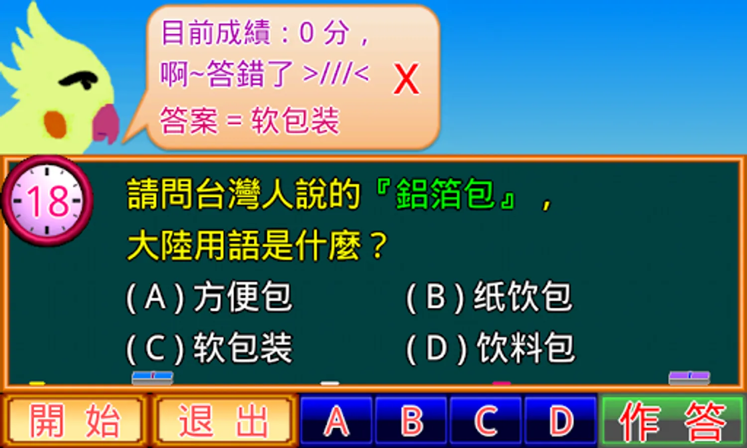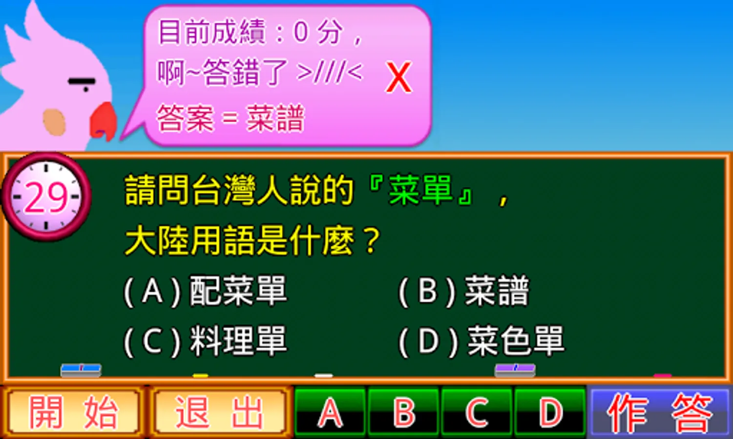 The question and answer options for mainland language use the Simplified Chinese cross-strait terminology question and answer.