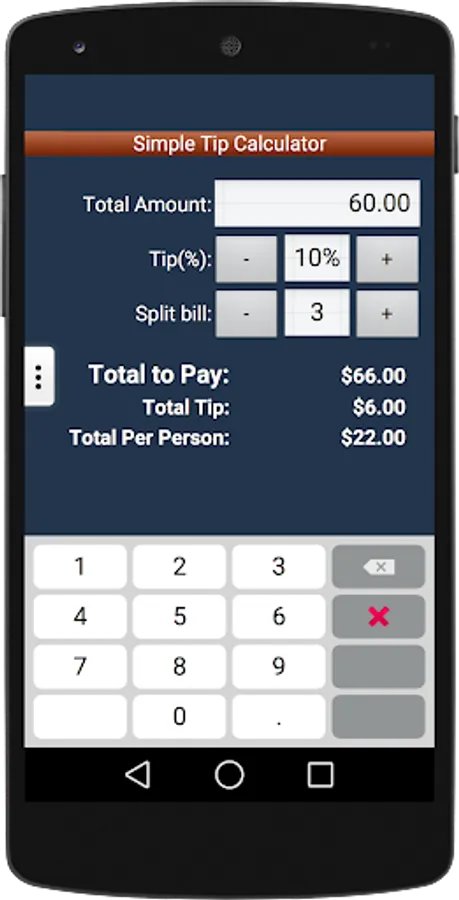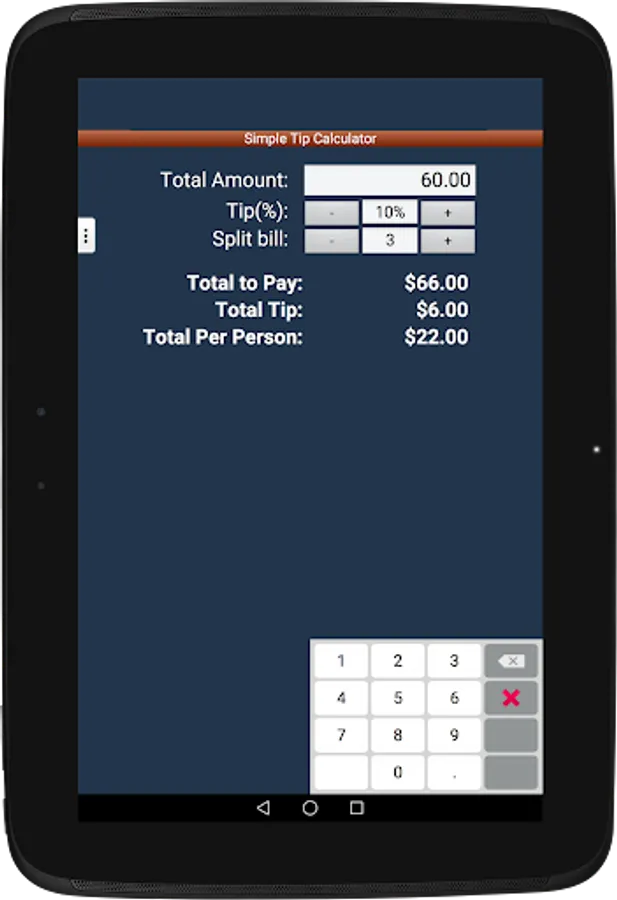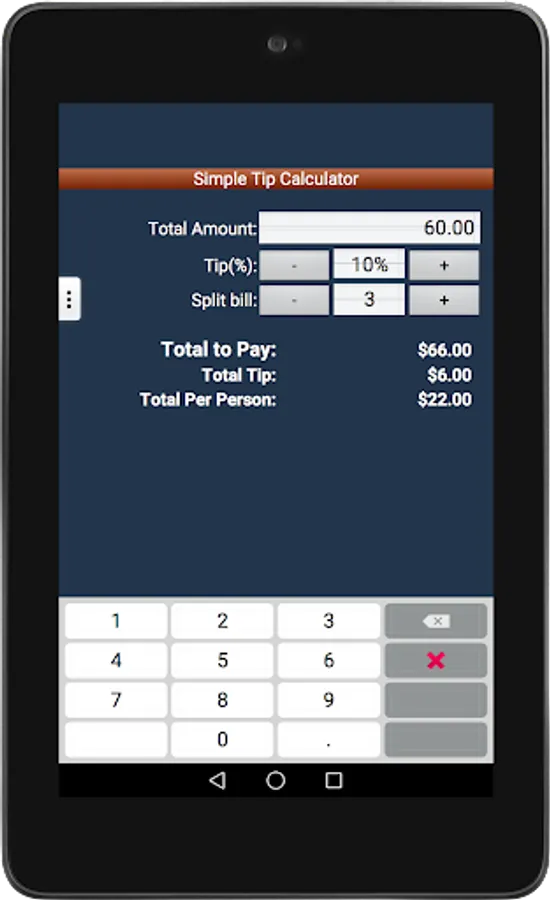 A tip calculator that is straightforward and easy to use. You will love the large, easy-to-see buttons and numbers. You can quickly calculate the tip and split the bill with little effort.