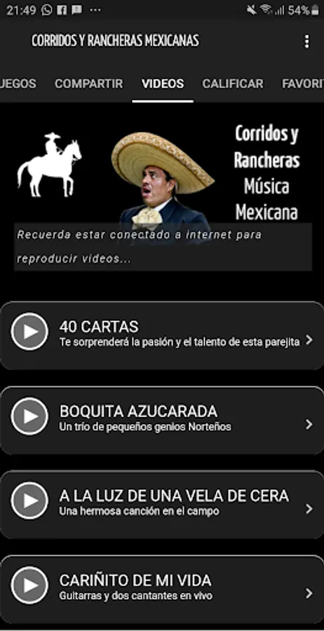 You can also share by all possible means your favorite rancheras and corridos app, since the "Share" function is incorporated into the app, and in a simple step you can perform this function.
