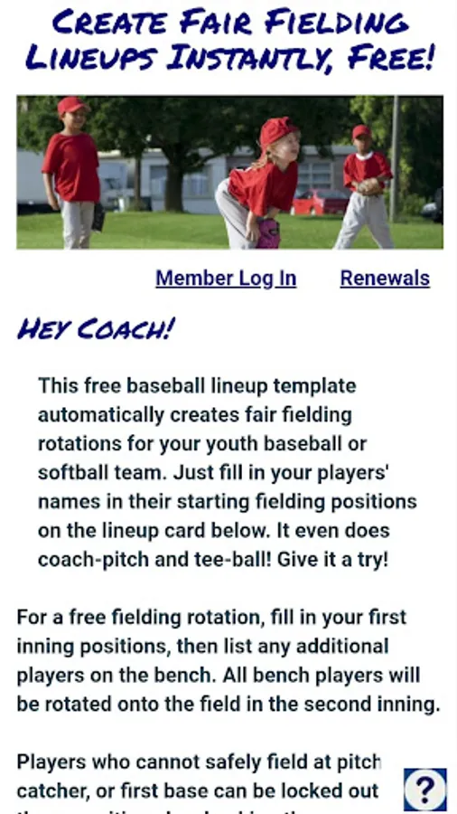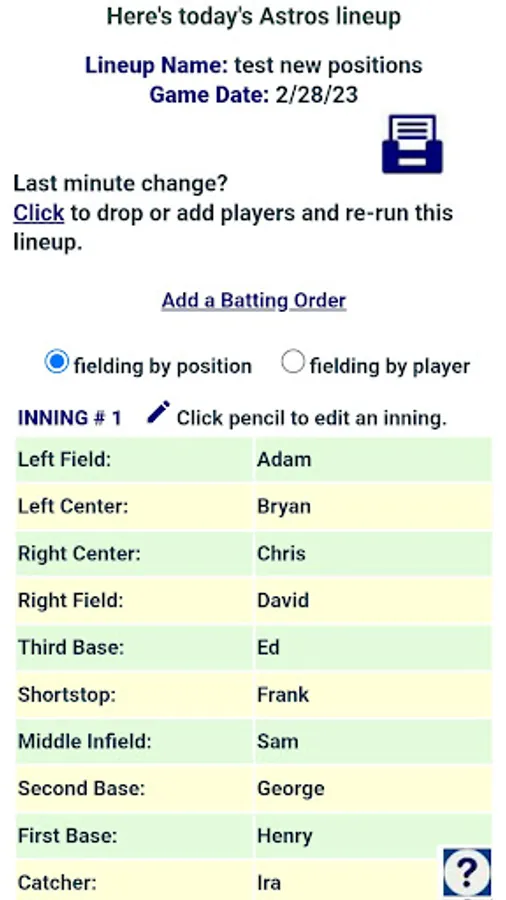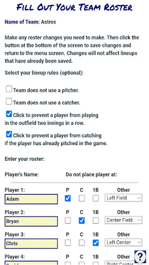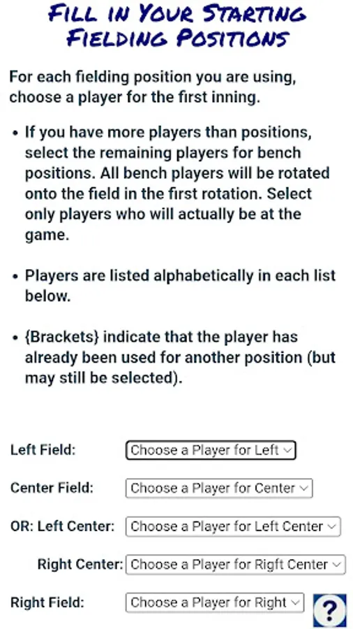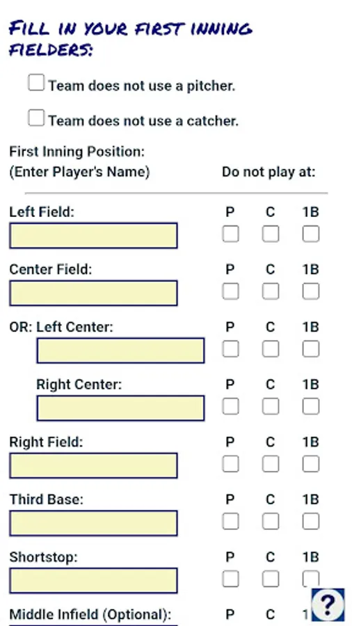 You can build lineups for up to 11 fielding positions, or for coach-pitch or coach-catch. Plus up to 6 bench positions, which rotate in after the first inning. And you can lock out individual players from playing first base, catcher, or pitcher, for safety. Give it a try!