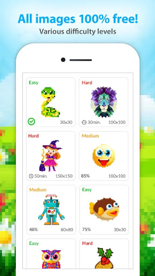 π¨ 9 Categories for any taste, such as: robot and fish pixel art, pixel art animals, emoji and butterfly color by number and many others