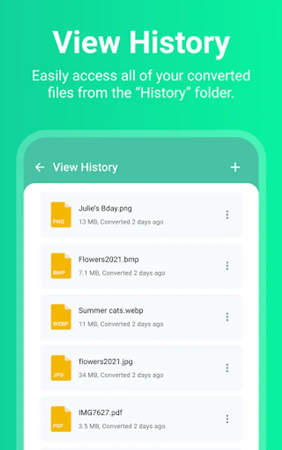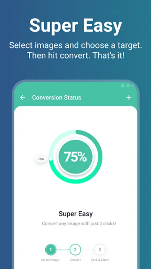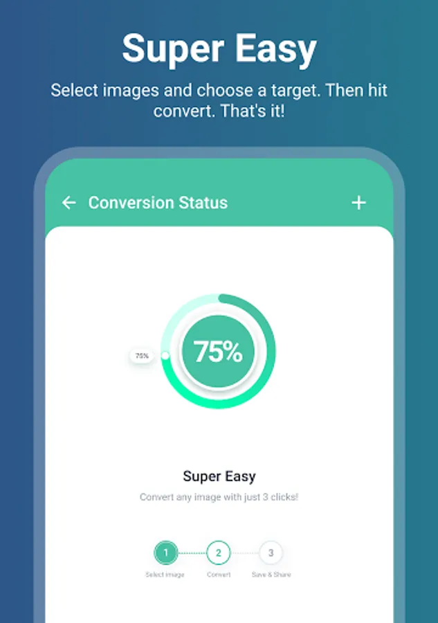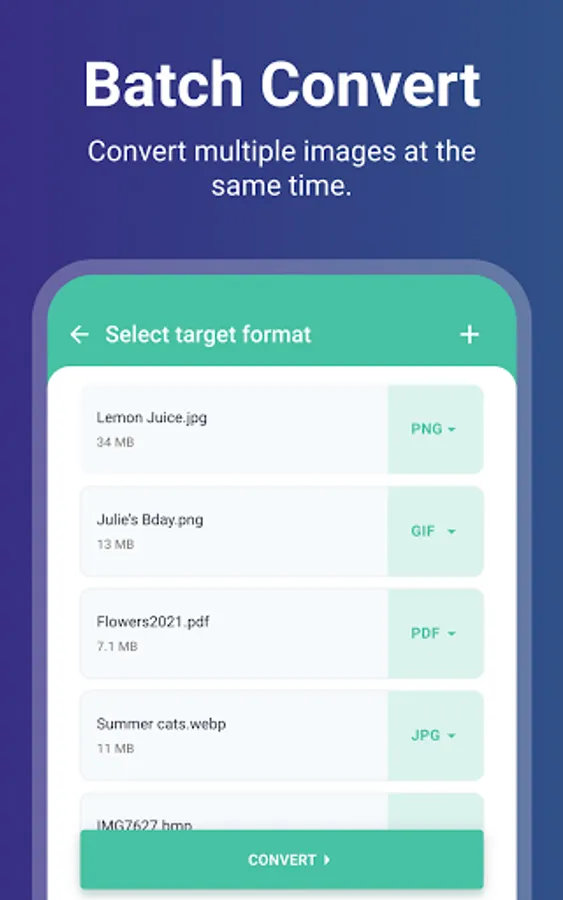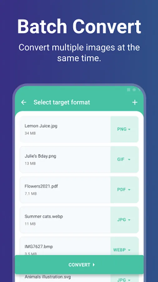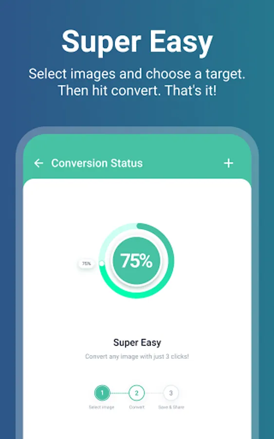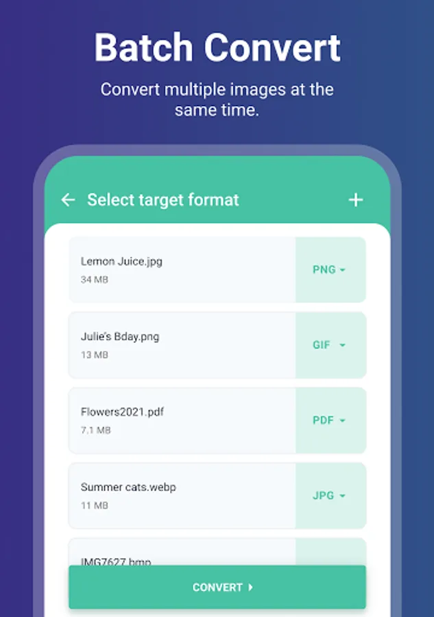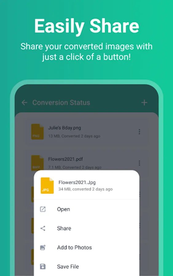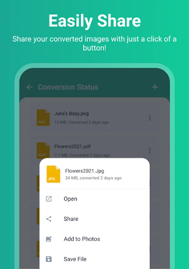 Select an image from your phone and choose a target format. Then, just click Convert! It is as simple as that. After conversion, you can easily share your photos with friends.