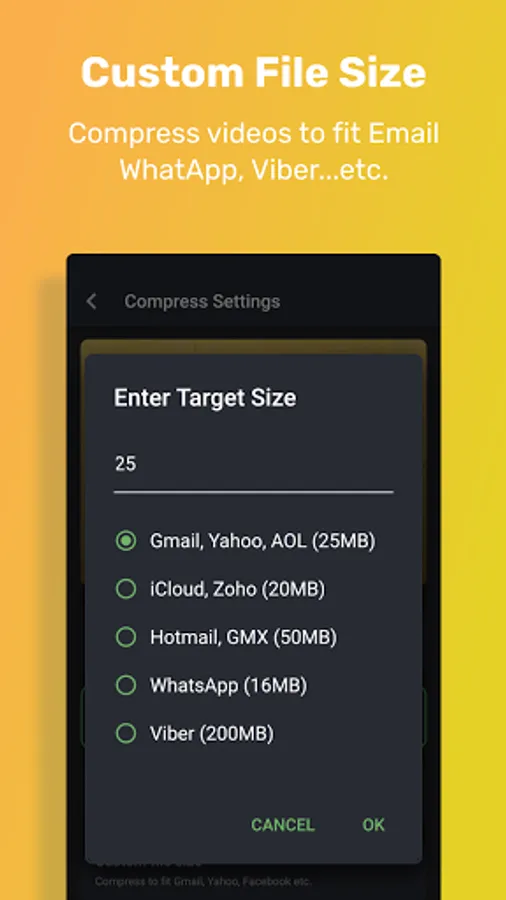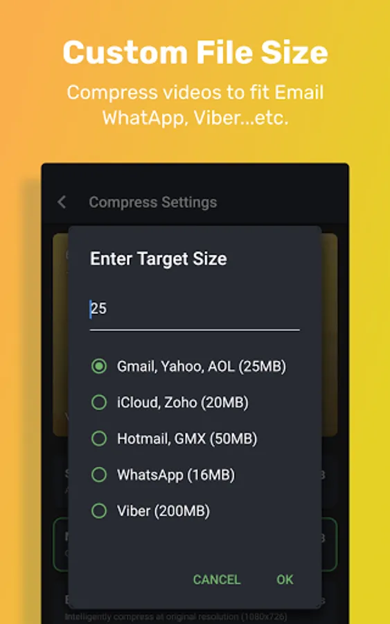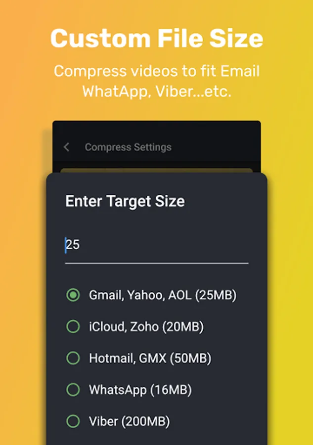 - Compress video files to fit Gmail, WhatsApp, Viber, iCloud, Discord, WeChat...etc.
