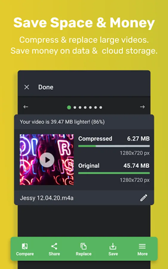 Is your phone getting full? Use the ShrinkVid video compressor to shrink and replace videos that take up space. It can also save you a lot of money on cloud storage.