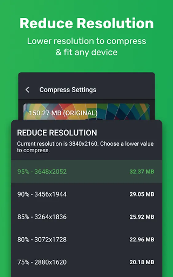 If your phone is full, most likely it is because a few large videos are taking up space. Our in-app gallery makes it super easy to sort your video library by size, name, date...etc. So you can easily find and compress any video on your phone.