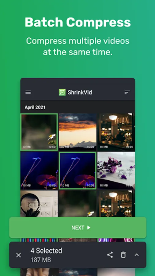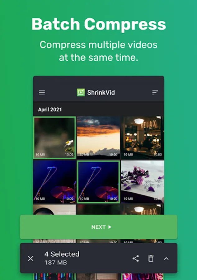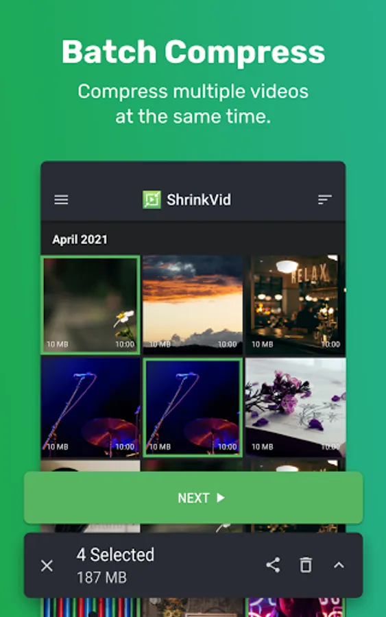 Do you have many videos that you wish to compress? You found the right app! ShrinkVid video compressor can easily batch compress videos. You can even apply different video compression settings to each video or apply one setting to all of the videos.