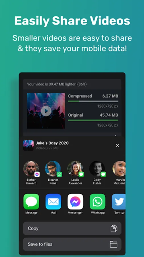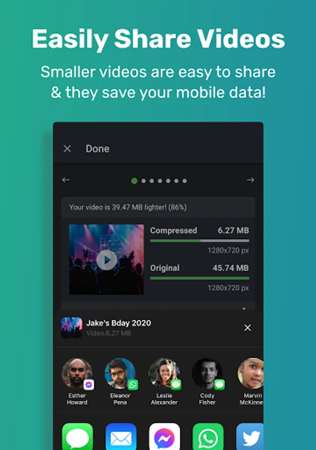 Compress video to your desired file size and easily share it over e-mail, chat, or social platforms.