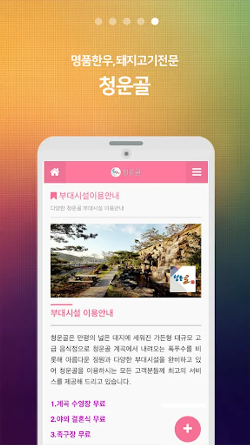 There are waterfalls, valleys pool, outdoor wedding, natural flows in the spacious 10,000 square meter land, the chapter Footwear, Healing Forest Cat, karaoke facilities are available various facilities to an outdoor terrace for free.