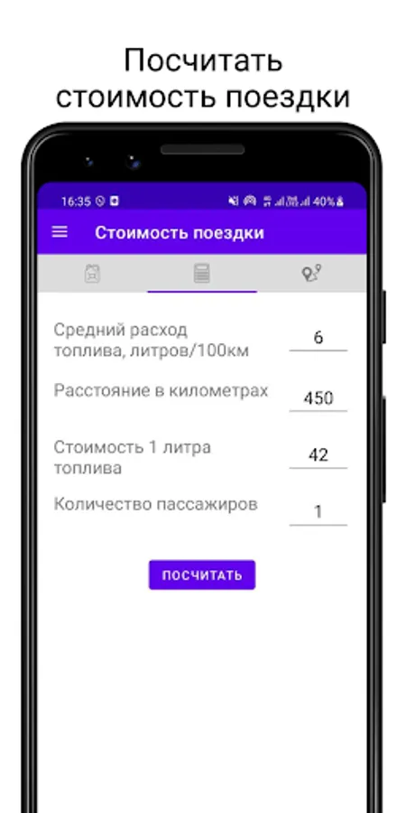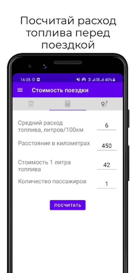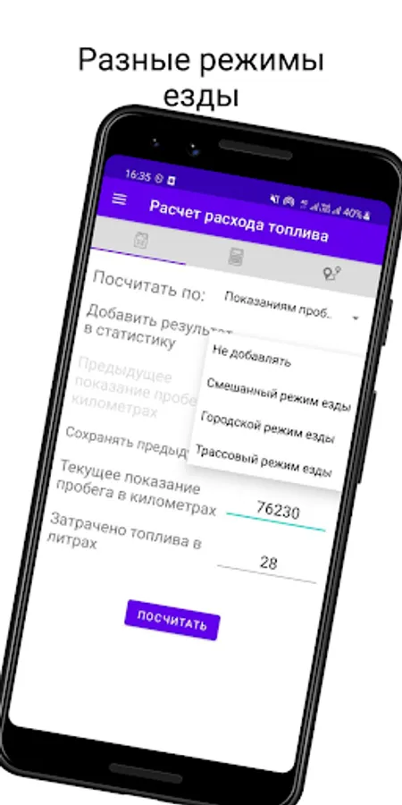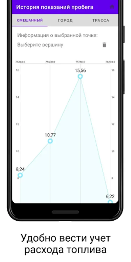 - Keep track of fuel consumption depending on the driving mode - highway, city, mixed mode;