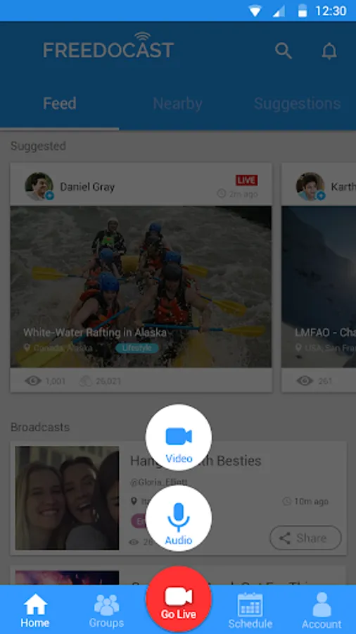 Freedocast is a free live video/audio broadcasting and streaming app. Your followers will be notified instantly when you go live. On Freedocast you can join, chat and send claps to your favorite broadcaster in real time. You can share on Facebook, Twitter before you start the broadcast so that your friends can live stream your video.