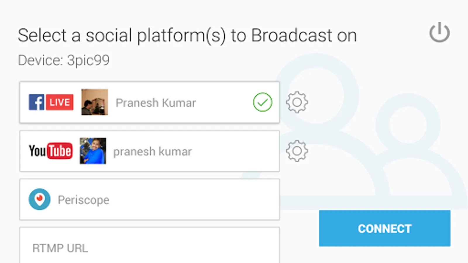 Connect your Facebook, YouTube, Twitter accounts in Freedocast Pro App to broadcast Live on Facebook Live, YouTube Live, Twitter/Periscope Live.