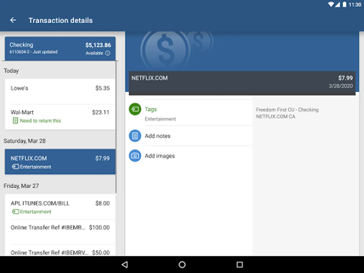 Add Tags, Notes, Images & Geo-Information: By enhancing transactions with custom tags, notes or photos of a receipt or check, you have the ability to stay organized and find exactly what you’re looking for when searching through your finances.