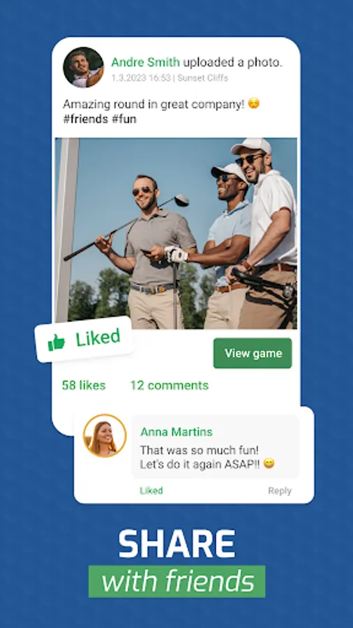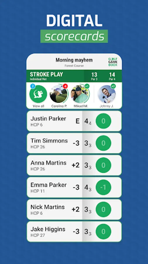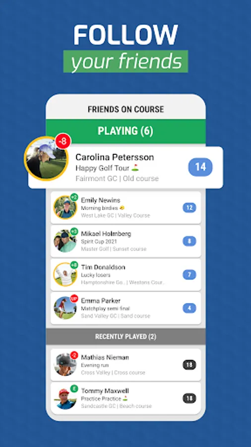 Connect with over a million golfers, share your rounds, golf score keeper, use the score tracker, golf range finder, live golf scorecard, & enjoy golf with your friends on & off the course. With the handicap tracker you can see your progress.