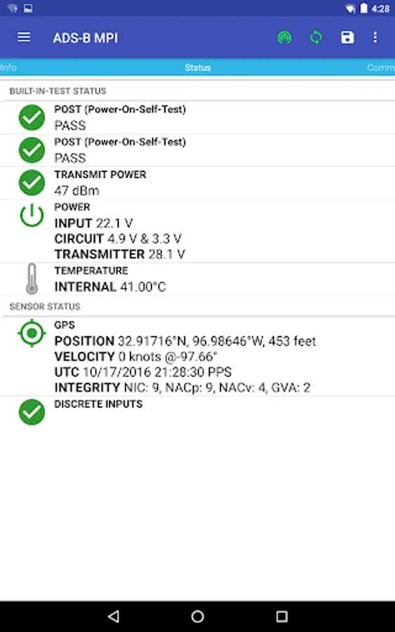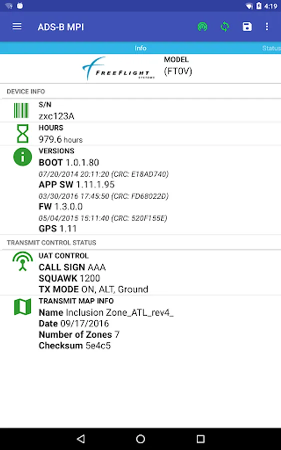 ADS-B MPI is the user interface to configure and view status of ADS-B transceivers and receivers via the WiFi-MPI Module or aircraft WiFi Module. The WiFi-MPI Module interfaces to the maintenance serial port of ADS-B units via Wi-Fi. Install ADS-B MPI on an Android tablet or phone and you'll be able to configure, view status, and troubleshoot your ADS-B unit. ADS-B MPI provides the interface to your ADS-B unit to do the following: