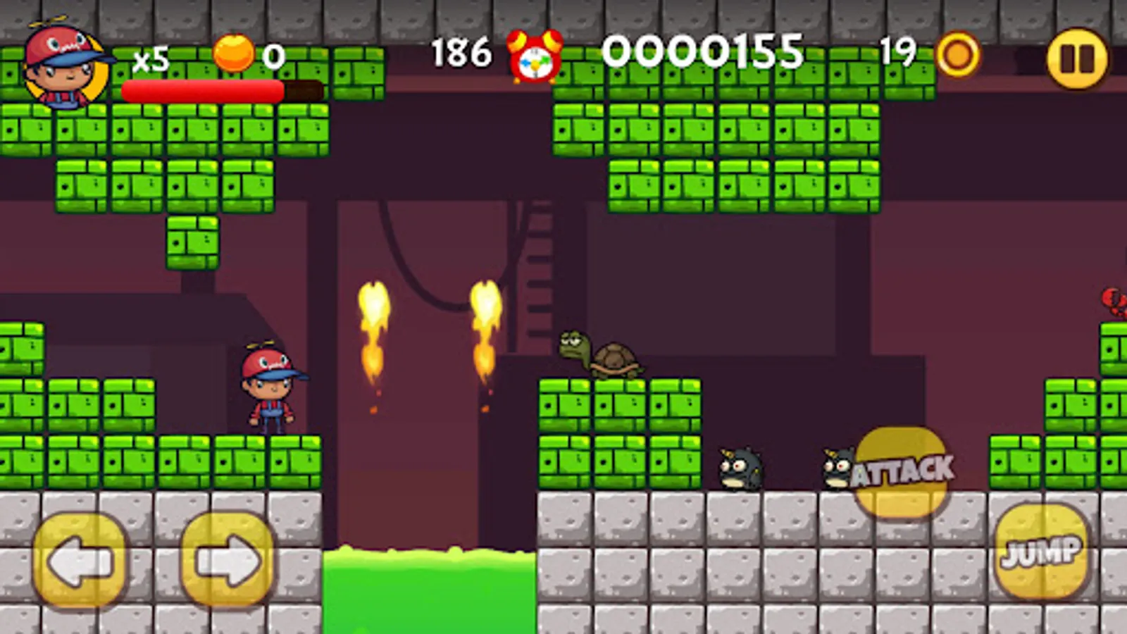 It is a very easy jungle running game that is full of entertainment and enjoyment in the jungle. This Super Bob Running Game has very smooth gameplay control and is easy to play. You can easily control it with the help of different buttons. You have 5 different buttons in this Super Hero bob super hero jungle adventure game. You can jump by clicking the jump button and with the left and right arrow buttons you can move to run left or right. There are two other buttons with the help of these two you shoot the enemies and with the attack button, you can kill the duck or snail in the game.
