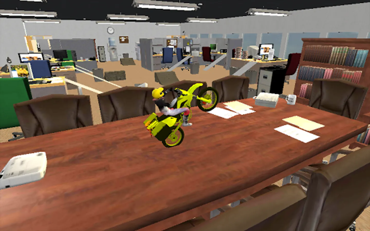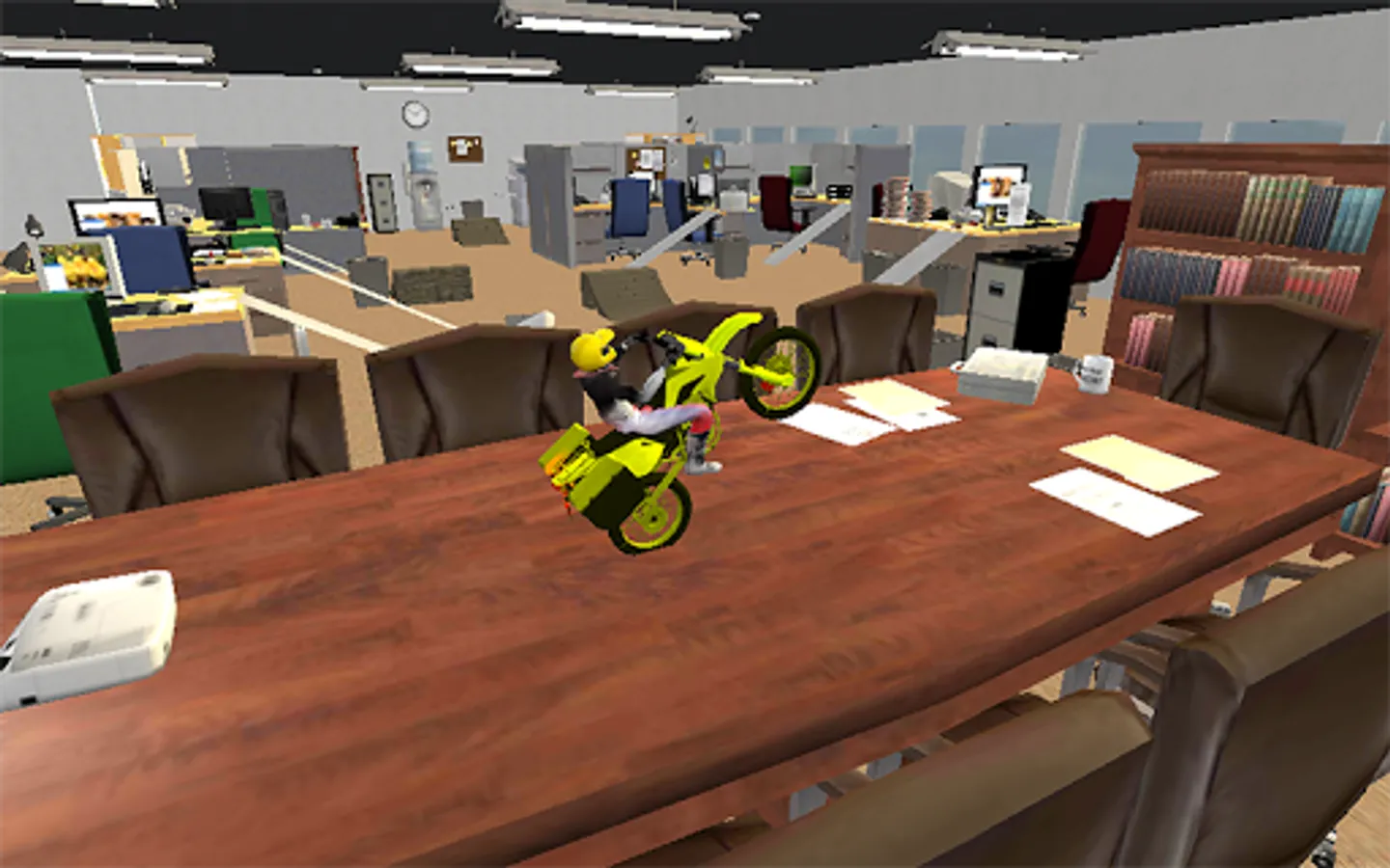 Race your dirt bike over the desks doing stunts, jumping, computers, office chairs and so much more! over everyday obstacles Then this fast speedy racer Office Bike Racing is yours for free now!