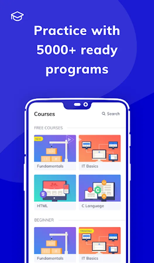 With a huge collection of 5000+ programs (code examples), 20+ courses and the fastest compiler in the world, all your programming needs are bundled in a single app for your daily practice.