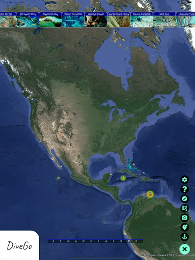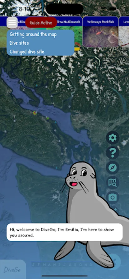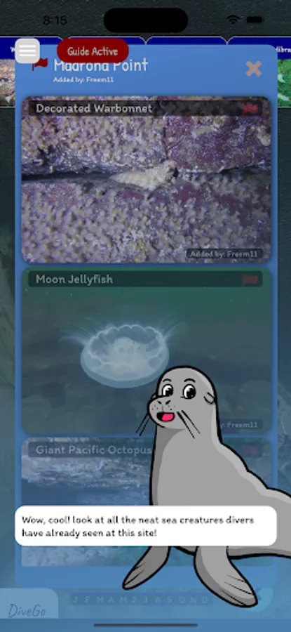 As you move the map around the picture carrousel at the top will adjust to show all sea creatures seen in that area, tap on one or more to filter the heat map to show where specific creatures are. The month histogram at the bottom will also update so show you the beast season for spotting selected sea creatures in that area.