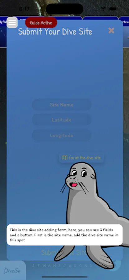 Is your dive site not on the app yet? no problem pull you phone out while you at the site and hit the "I'm at the dive site" button, DiveGo will grab your current GPS coordinates, add the dive site name and submit.